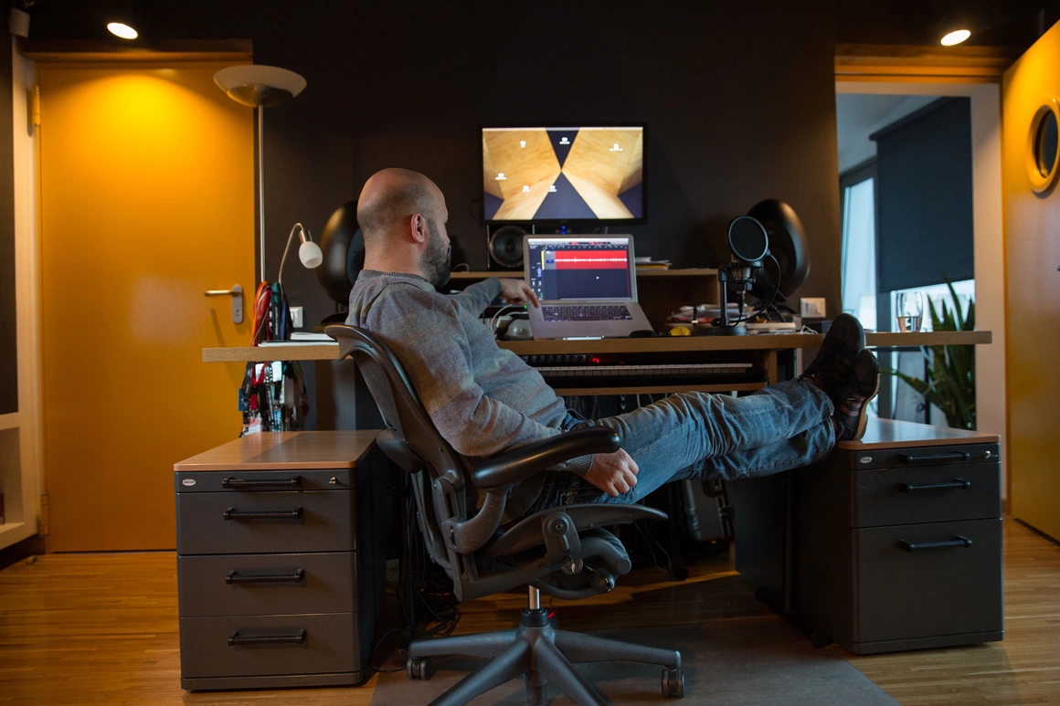 Depinde ce vrei de la camera și studioul ăla. Dacă vrei să înregistrezi instrumente, nu trebuie neapărat să fie complet închis sau să pui cartoane de ouă sau burete. Pentru că poți să folosești ecoul unei camere și sună foarte bine. De aia se înregistrează de multe ori în spații dintr-astea.. Celebrele tobe ale lui Bonham erau trase pe casa scării, într-un conac, cu microfoane puse la nu știu ce etaj, ca să aibă sunetul ăla superbaban. Dacă vrei să lucrezi înăuntru, cum fac eu, ar trebui să nu ai ecouri și reflexii. Camera asta e construită de un acustician, proiectată pentru punctul ăsta de-aici [aici, adică pe scanul de la birou] - aici se aude cel mai bine și e foarte diferit dacă te muți. Începi să ai sunete neechilibrate. Dacă ești într-o zonă cu zgomot, ar trebui să te izolezi de zgomotul de afară. Dacă tu faci foarte mult zgomot pentru că lucrezi la un volum mare, ar trebui să faci un alt fel de izolare ca să nu-i deranjezi pe vecini.