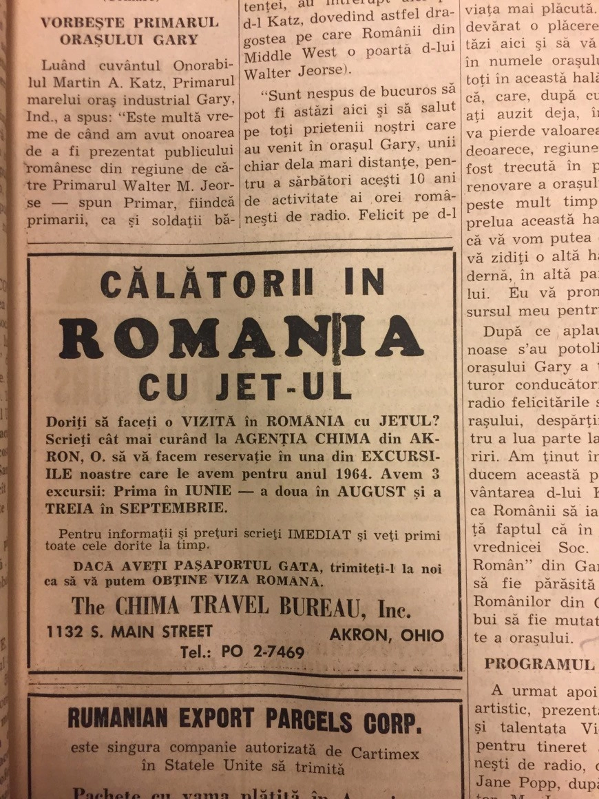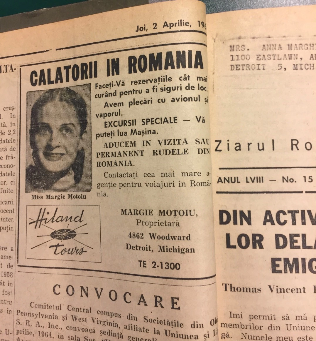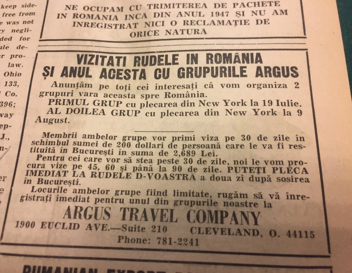 În ziarul românesc America, tipărit în Cleveland, Ohio, sunt reclame la excursii în România. În ediția din 2 aprilie, 1964, apare următorul anunț: „Vizitați rudele în România și anul acesta cu grupurile Argus. Anunțăm pe toți ce interesați că vom organiza 2 grupuri vara aceasta spre România.” Organizatorul: Argus Travel Company, cu sediul în Cleveland, Ohio. La pagina următoare găsim o altă reclamă cu excursii organizate în România de Hiland tours, firmă deținută de Margie Moțoiu din Detroit, Michigan. La altă pagină apare un anunț pentru „Călătorii în România cu jet-ul”, organizate de The Chima Travel Bureau, cu sediul în Akron, Ohio.