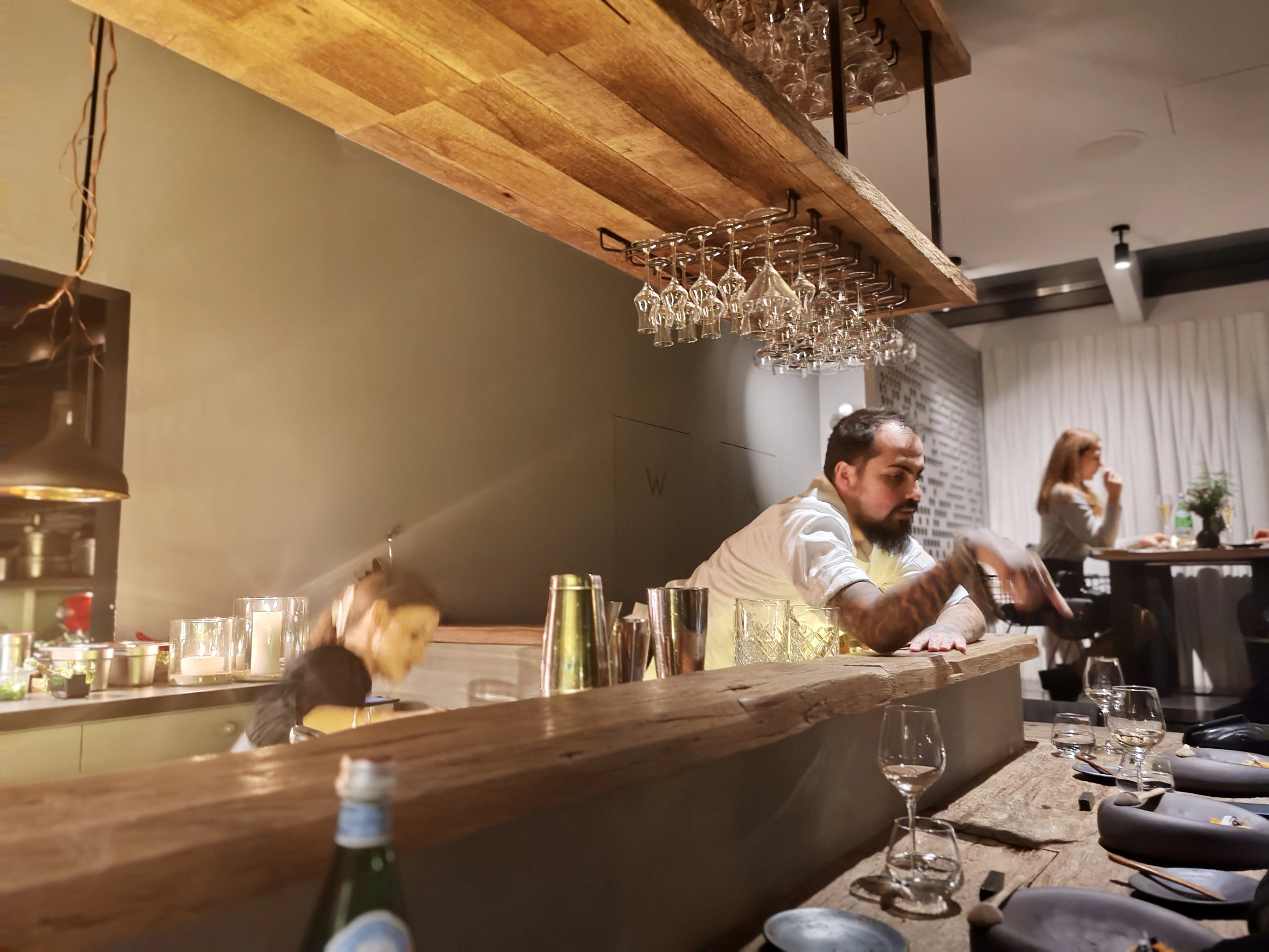 În spatele barului, o tânără prepară cocktailuri la foc automat și nu uită o clipă să le zâmbească oaspeților. În bucătăria deschisă din spatele ei, mâinile care așează microgreens pe platouri spectaculoase nu prididesc cu detaliile de plating. Înconjurat de echipa lui în uniforme negre, chef Radu Ionescu (32 de ani) e o siluetă în alb care supraveghează cursul lucrurilor, de la plasarea comenzilor până în momentul în care strigă „Service!”. Un cor de voci tinere îi răspunde invariabil: „Da, chef!”.