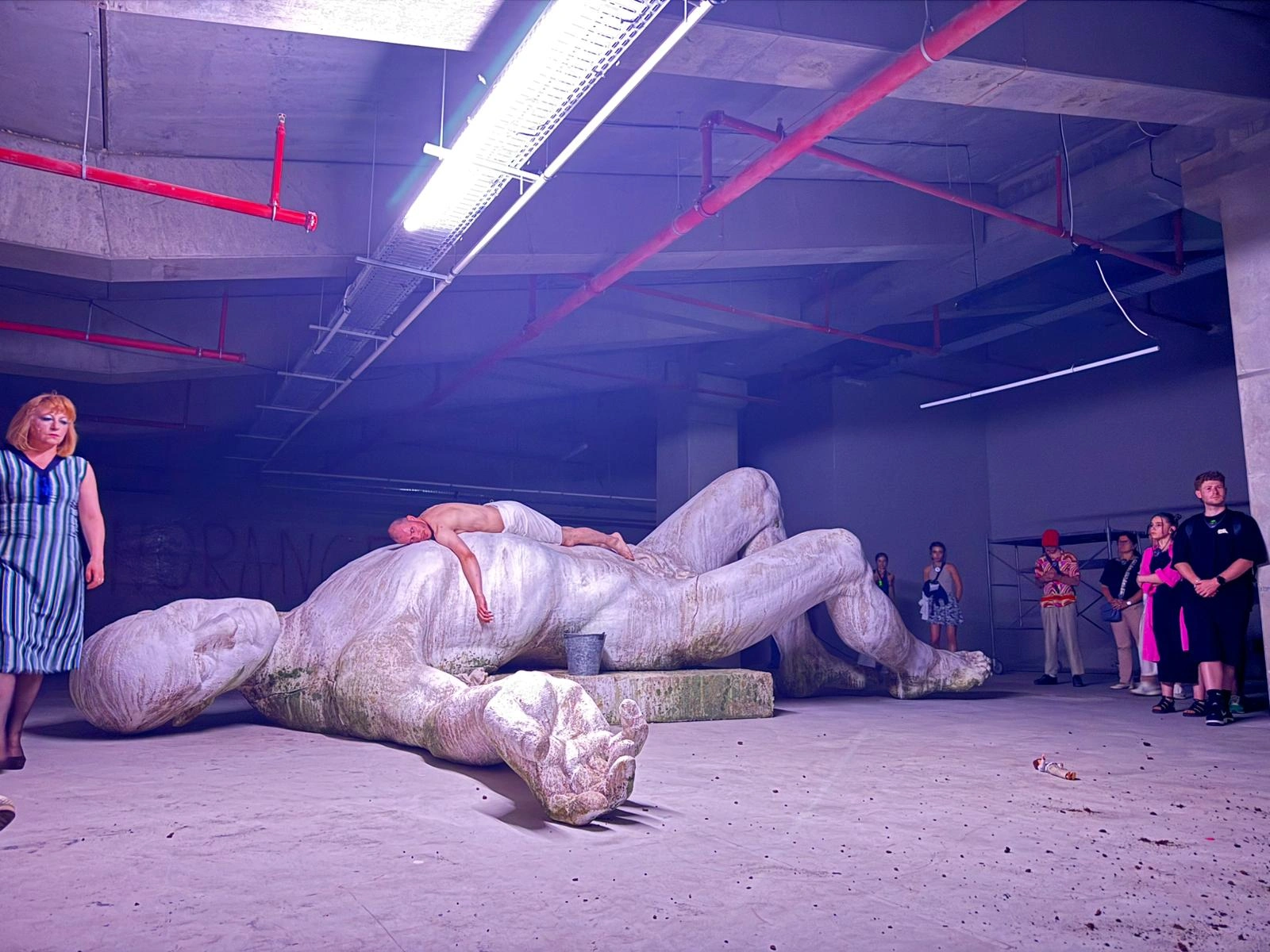 Și pe urmă Oana a venit, după o discuție, cu această idee a îngerului. Care inițial apare mai degrabă ca un corp. Mort, leșinat. Acolo, în spațiu. Și el se transformă în acest înger la final, cu aripa pe care i-o aduc ceilalți și care se ridică. Fața statuii este chiar fața lui Marc. Și asta e un fel de îngropare a unor lucruri. El nu este îngropat în pământ.