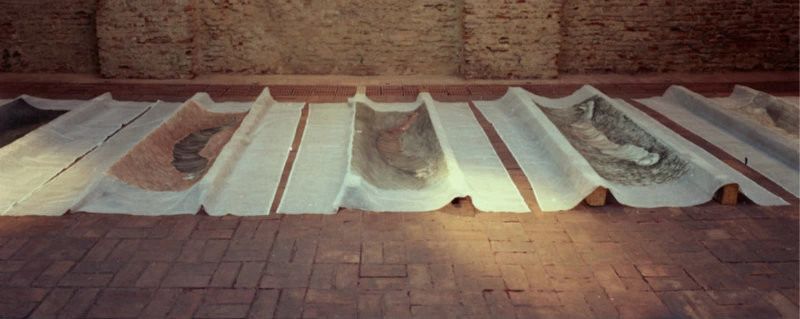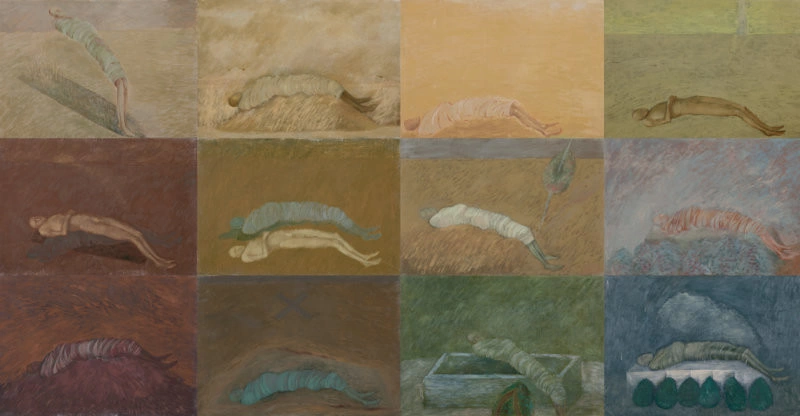 Pe scurt - culorile sunt aceleași, tratarea suprafeței picturii e aceeași, iar corpul alungit în mod absurd al lui Lazăr, semn al sfințeniei probabil, e acoperit de un giulgiu, care seamănă foarte mult cu obiectele din seria mult mai abstractizată din expoziție. Dar seria care prefigurează chiar și lucrările din ciclul Lazăr și care e mult mai utilă pentru a stabili o progresie a transformărilor formelor, dar și a semnificațiilor din pictura Simonei Runcan este seria Lamenta / 1987 – 1991, din care putem vedea câteva imagini mai jos. Aici avem și corpul și materialul textil și funcția lui – de giulgiu, dar și acest giulgiu tranformat în motiv pictural în lipsa corpului, trimițând probabil la faptul că Lazăr e viu.