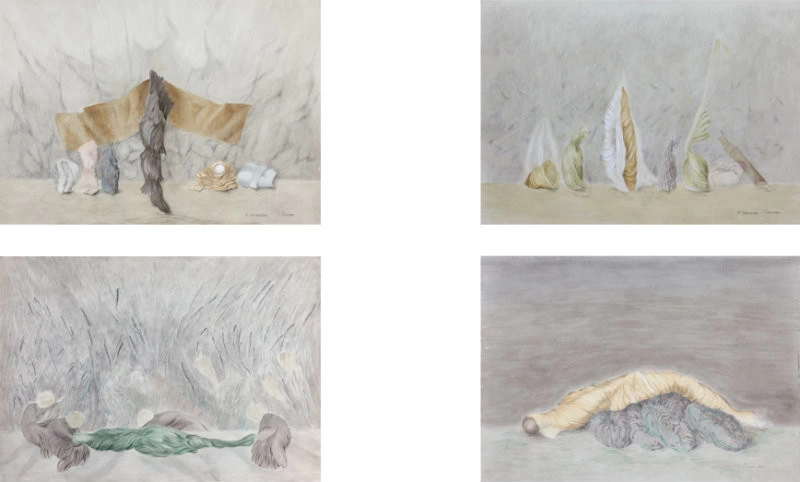 Pentru început, trebuie spus că formele textile în torsadă sau con sunt, de fapt, o legate de universul vizual al artistei, aceste forme fiind prezente în diverse ipostaze și în alte serii de picturi. De exemplu, în seria Lazăr în așteptare / 1992-1994, regăsim deja o mare parte din inventarul formal, cromatic și textural din Conviețuiri silențioase, după cum se vede mai jos.