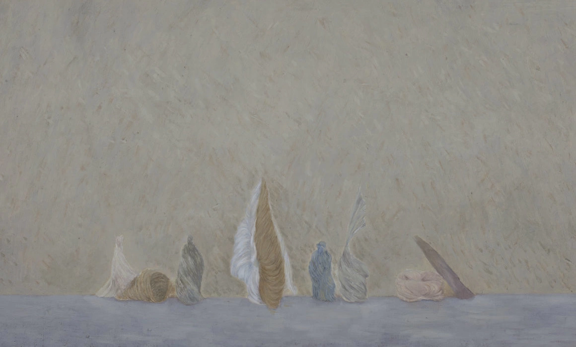 Dacă ar fi să scriem o fișă de inventar, ea ar consemna următoarele: 15 picturi pe pânză, majoritatea rectangulare, de dimensiuni între 80 x 80 și 90 x 90 centimetri. Naturi moarte. O tratare a spațiului care trimite la bidimensionalitate, cu mici accente tridimensionale – adică micile obiecte care par strivite, ori par că se ascund sau sunt complet refugiate între fundalul care acoperă aproape toată imaginea și planul orizontal. Oricum, un spațiu care nu depășește extensia în adâncime a respectivelor obiecte, care par niște torsade de material textil, niște conuri sau niște resturi colecționate de artistă de pe plaja de la 2 Mai. Compoziția e mereu aceeași. Deasupra, un fundal mare monocrom, dedesubt o mică fâșie orizontală, între care se desfășoară obiectele bizare, diforme, greu de numit, într-un aranjament vizual mereu diferit de la o pictură la alta.