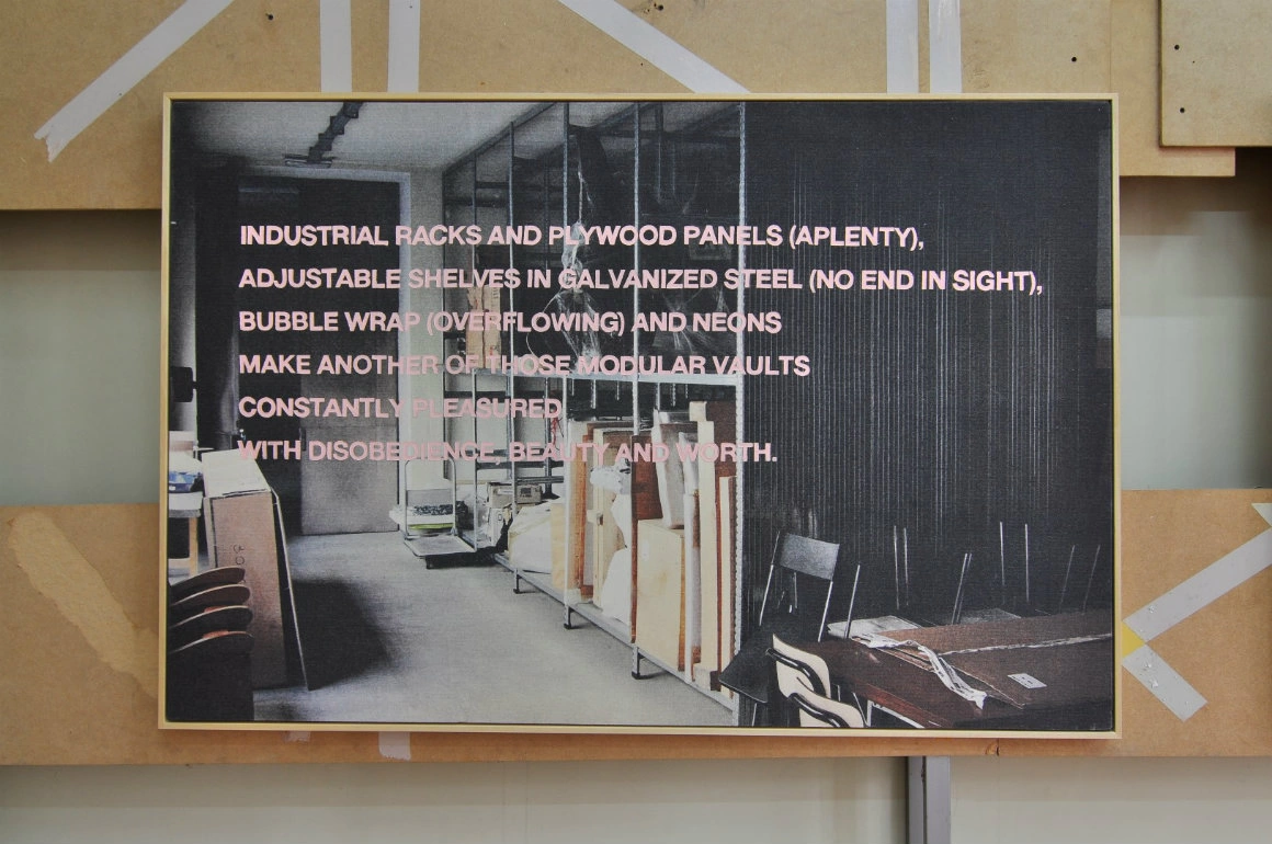 Ca să tranșez lucrurile rapid, aș spune că programul propus e legitim. La bază, vorbim de o versiune a deturnării lui Guy Debord, poate cu un accent prea mare pe aspectul plăcut și spectaculos al produsului final, punct din care ar putea porni și o critică radicală a muncii Apparatus 22. Un alt punct de unde poate porni o critică radicală a acestei expoziții e faptul că textul, pe care îl consider punctul central, e în întregime în limba engleză. Dacă Apparatus 22 observă critic soarta lucrărilor de artă, ajunse în depozite la bogătani, ei nu sesizează că, folosind exclusiv limba engleză în textele lor, sunt parte dintr-o mișcare de colonizare a producției de artă locală, pe calea pieței internaționale, care, în mod firesc, favorizează conținuturi legibile în propria limbă. Pe mine, ca privitor, m-ar fi lovit mai tare niște propoziții pe românește. Și asta ar fi distrus in parte și caracterul dominant grafic al picturilor, oferindu-le dimensiunea textuală de care au nevoie.