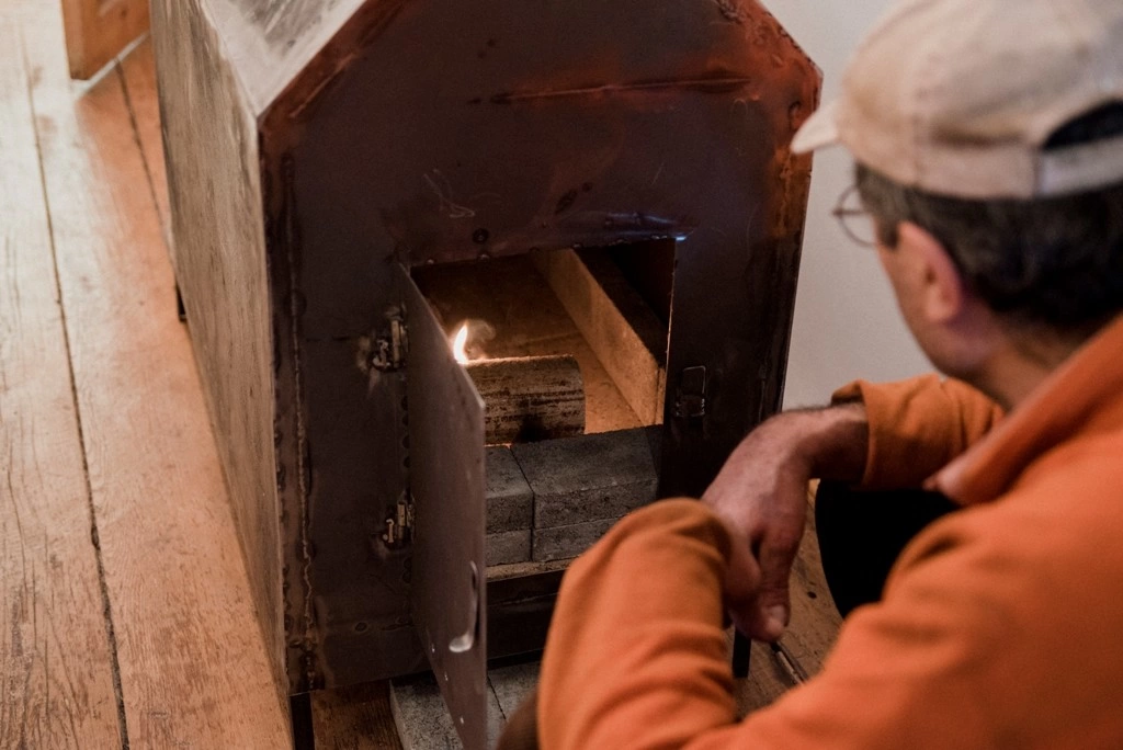 Din start, e nevoie de o completare chiar la acest nivel de conținut, pentru că expoziția nu vorbește doar despre moarte. Miezul universului simbolic pe care ni-l propune expoziția lui Belu-Simion Făinaru, sculptor israelian de origine română, este imaginea casei. Care e prezentă la etajul întâi, transformată într-o sobă de tablă. În sobă se pun pastile de rumeguș și înăuntru arde un foc. Acest foc face trimitere și la arderea de tot, traducerea mot-a-mot a cuvântului Holocaust.