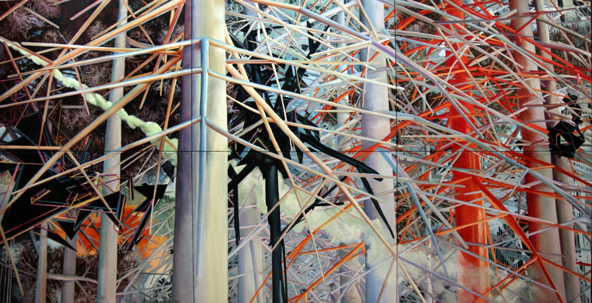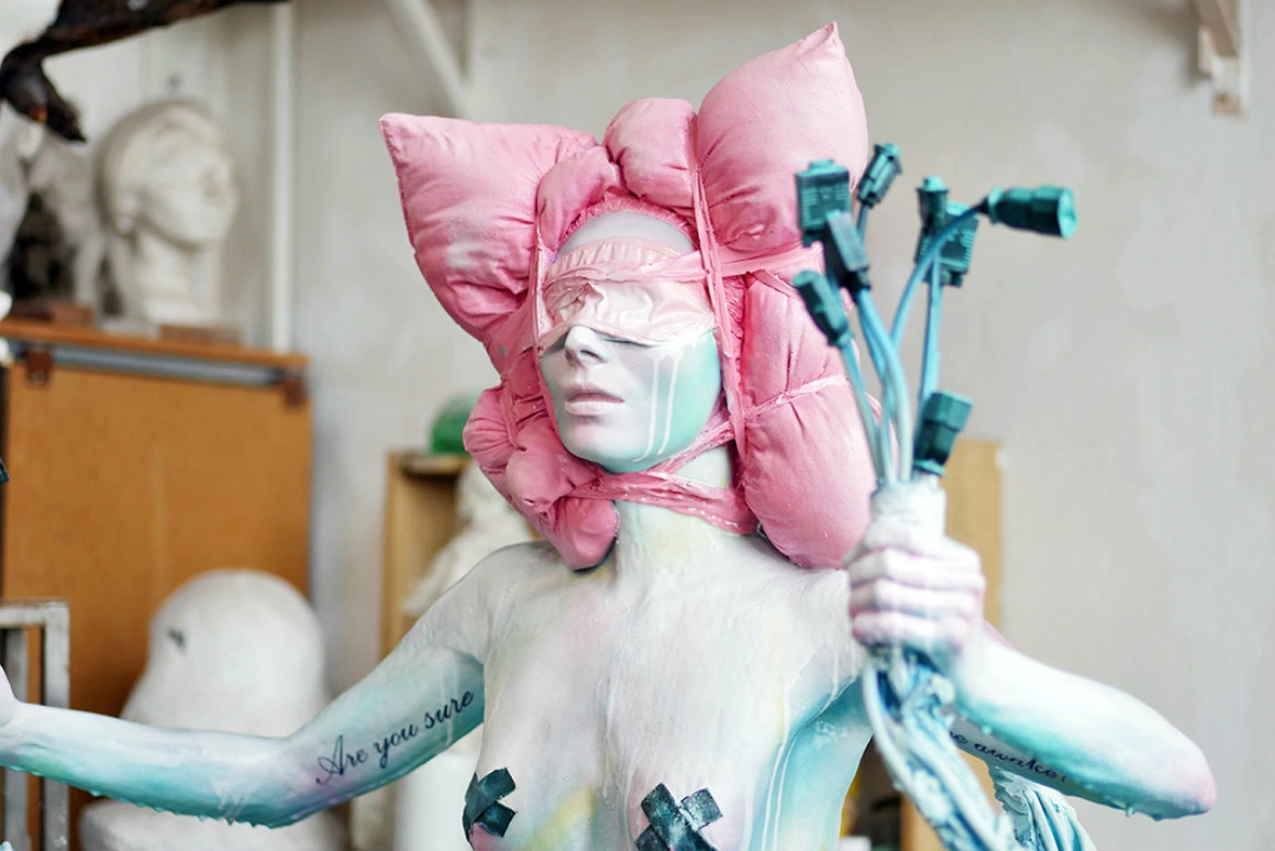 Întoarcerea asta la taiga, pe care-o tot revizitează în arta lor, a însemnat și o întoarcere acasă a Oxanei, care a copilărit într-o pădure din apropierea Moscovei. Cunoștea toate locurile și toți copacii, iar de-acolo, din apartamentul lor din ghetou, au început să imagineze spații naturale hibride, în care-ai putea confunda copacii cu niște antene, și-n care întâlnești creaturi dintr-o nouă mitologie digitală, construite din materiale sintetice și materiale naturale. Minotaurul Crocodile Power, din seria Out of Range, stă pe picioare din trunchiuri subțiri de copac și se uită-n telefonul înfipt în selfie stick așa cum probabil se uita Narcis într-un ochi de apă. În lucrarea Not Yet, din proiectul Insomnia, e sculptat un fel de înger/astronaut, suspendat într-un cocon translucid din cabluri și fibră de sticlă, cu fața luminată de o aură de neon. „Aici, inspirația a venit de la măștile mortuare - nu știi dacă oamenii ăia sunt sau nu acolo, dacă-s morți sau doar dorm. La fel și-n lumea noastră digitală, uneori nu mai înțelegem care realitate e realitatea. Poate că nici mai suntem umani. Poate că suntem androizi și avem niște bug-uri. Nu înțelegem cum funcționează treaba asta, dar mergem mai departe”, spune Oxana. În același timp, peisajele lor au ceva din basme, unde-n pădurea misterioasă se-ntâmplă întâlniri și transformări decisive, și din imaginarul SF alimentat de copilăria cu vise despre viitor post-apocaliptic. Natura din picturile lor nu-i însă câtuși de puțin idilică, fiindcă poartă cu ea toate urmele schimbării. „Acum, mă uit la locurile unde-am crescut și nu mai sunt la fel. Multe zone au fost defrișate și-au fost construite blocuri de locuințe”, explică Oxana, în timp ce-mi arată câteva picturi din The Borders of Memory, unde pădurile au tavan, iar copacii semnele care arată că au fost sau vor fi tăiați.