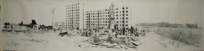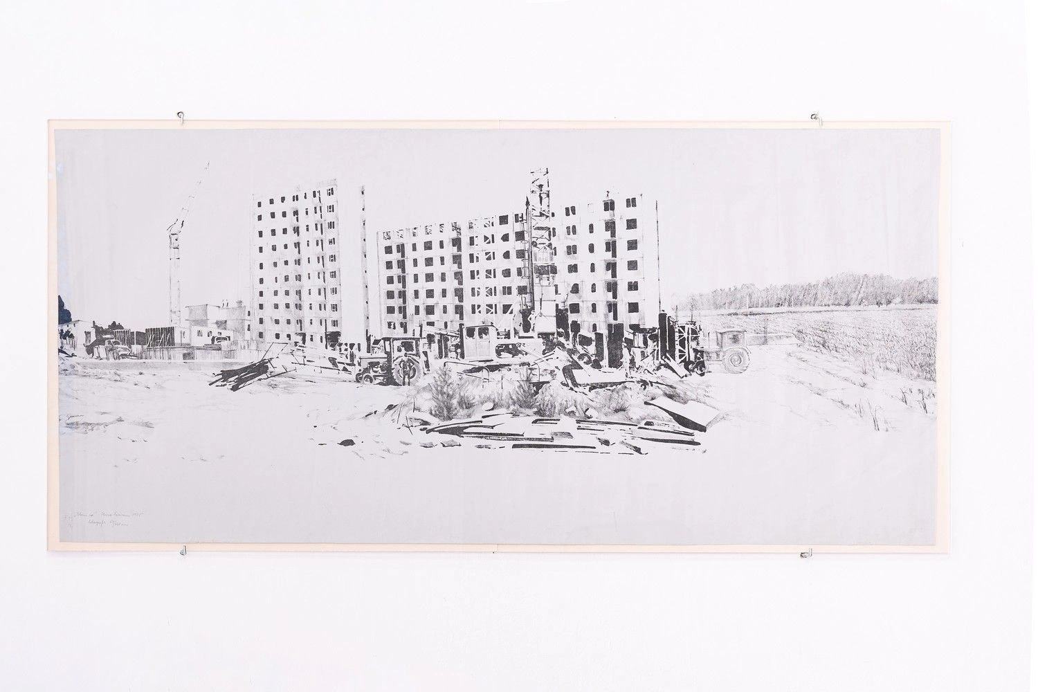 Ultima lucrare despre care vreau să vorbesc aici este și cea mai îndrăzneață inițiativă a artistei din punct de vedere tehnic. E vorba de o vedere panoramică a unui ansamblu de blocuri construite în plin câmp. În versiunea de la Galeria Ivan, lipsesc două bucăți din litografie în stânga și în dreapta, care măresc exponențial caracterul panoramic al imaginii în varianta originală.