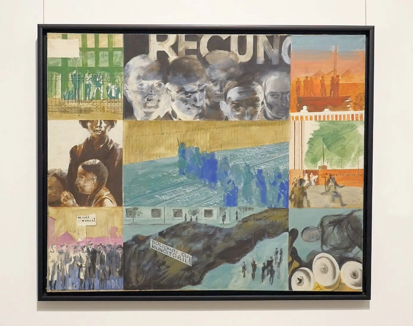 Florina Coulin se dovedește aici un student extrem de atent, în măsura în care nici cele mai mici subtilități ale metodei lui Ion Grigorescu nu îi scapă. Dacă privim în imaginea cu Grivița, doar masa de muncitori din partea de jos a cadrului, vedem că ea e tratată ca un fel de pastă amorfă, „care se scurge”. E, de fapt, o redare picturală a unui efect fotografic de lungă expunere, care transformă o masă de oameni în mișcare într-un peisaj urban într-o umbră prelungă, în care nu se mai recunosc personajele individuale. Și, dacă privim cu atenție, în panoul central din partea dreaptă a picturii Florinei Lăzărescu, vedem tot așa, o gloată de oameni, informă, la ușa unei instituții publice. Diferența dintre cele două imagini stă în principiul narativ care le organizează.