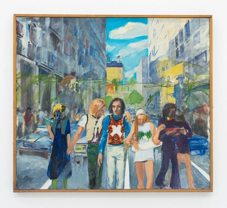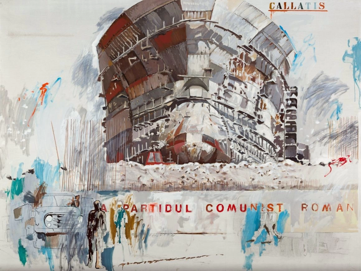 Pentru că nu pot să le prezint aici, arăt totuși o imagine din expoziție care se apropie, ca tematică, de lucrările menționate. Recunoaștem din nou sistemul de organizare preluat de la Ion Grigorescu, care presupune un tip de montaj al imaginii care seamănă cu montajul cinematografic. Dar mediul e altul, tema e alta și narațiunea e complet diferită.
