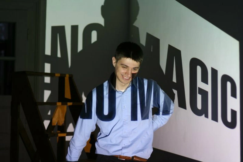 Sigur, fontul e altul și scrisul e luminat, în întuneric. Ești printre primii veniți. Apare și artistul.