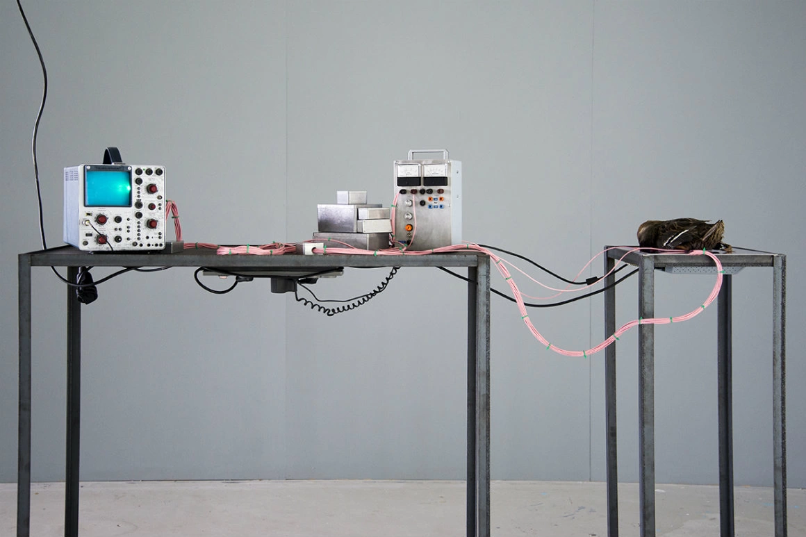 În centru, lângă fereastră, o variantă actualizată a instalației lui Amy Whittle – Artificial Afterlife / 2015. Trebuie să îți spun că în variantă de la Salonul de Proiecte, rața din imaginea de mai jos a fost înlocuită cu o bibilică moartă. Corpul animalului e cel care furnizează energia electrică necesară luminării furtunului cu leduri, dar și a aparatelor electronice de pe masă.