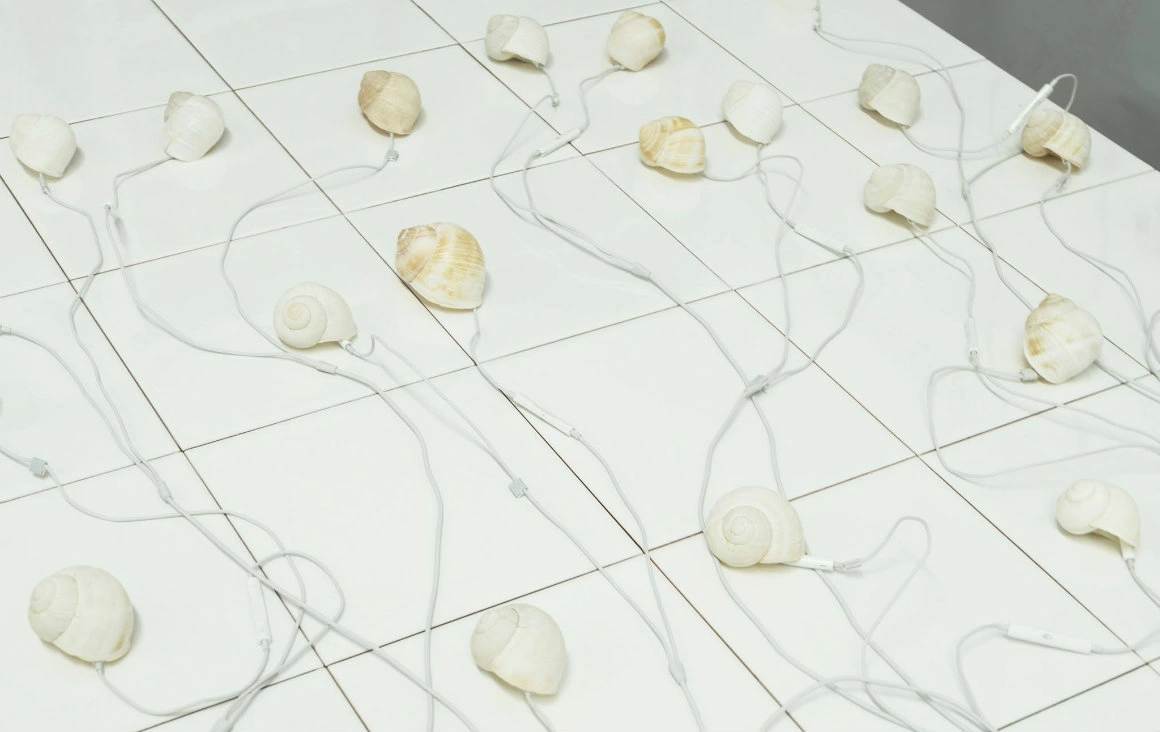 De partea opusă, lucrarea artiștilor români Nona Inescu, Vlad Nancă & Chlorys – Echo / 2017, o masă acoperită cu faianță, pe care sunt așezate mai multe scoici, în care au fost înserate căști audio. Scoicile amplifică sunetul din căști și funcționează ca niște cutii de difuzoare.