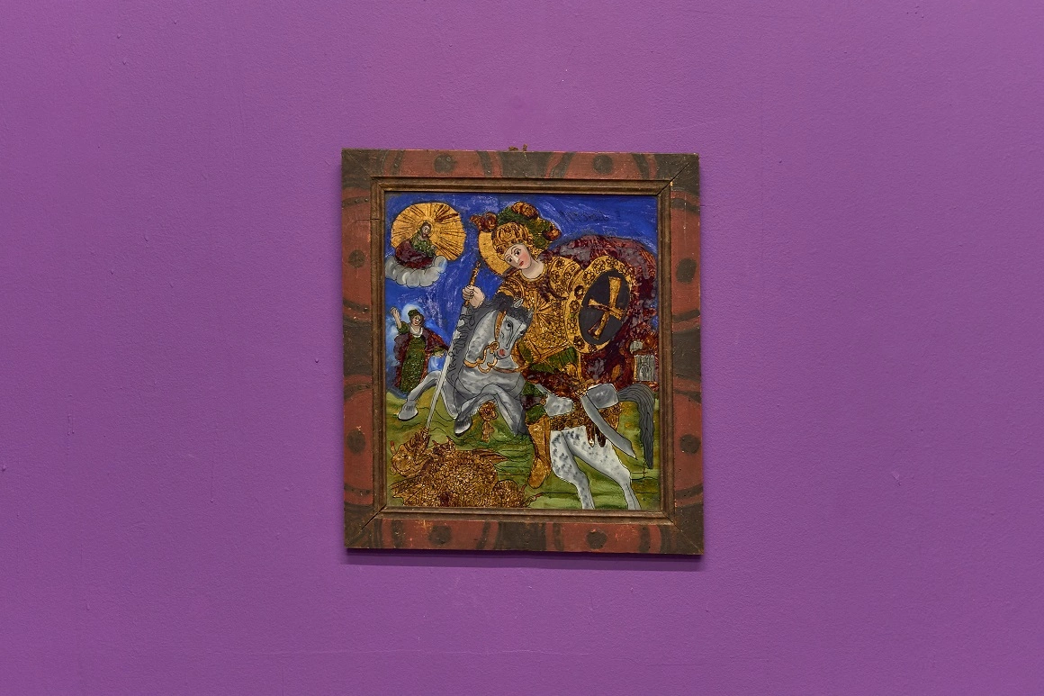 Alături de lucrarea impunătoare se regăsește o icoană de mici dimensiuni: o scenă cu Sfântul Gheorghe ucigând balaurul, pictată în secolul XIX în Transilvania de două femei, Emilia și Elisabeta Morar. Una din informațiile neașteptate și plăcut surprinzătoare pe care vizitatorii le vor lua acasă după vizitarea expoziției de la Timișoara este aceea că în secolele XVIII și XIX femeile au contribuit la înflorirea producției de icoane transilvănene pe sticlă.