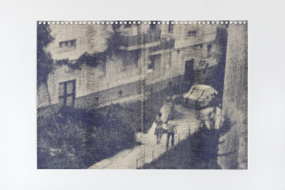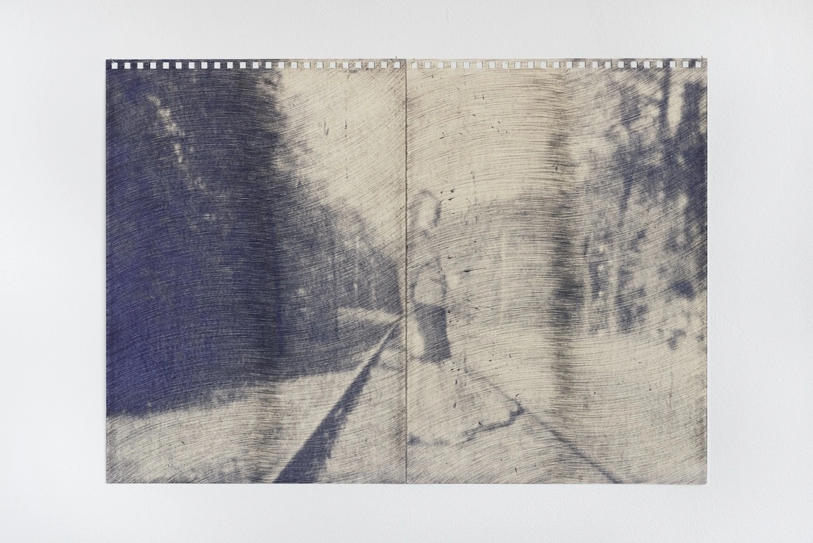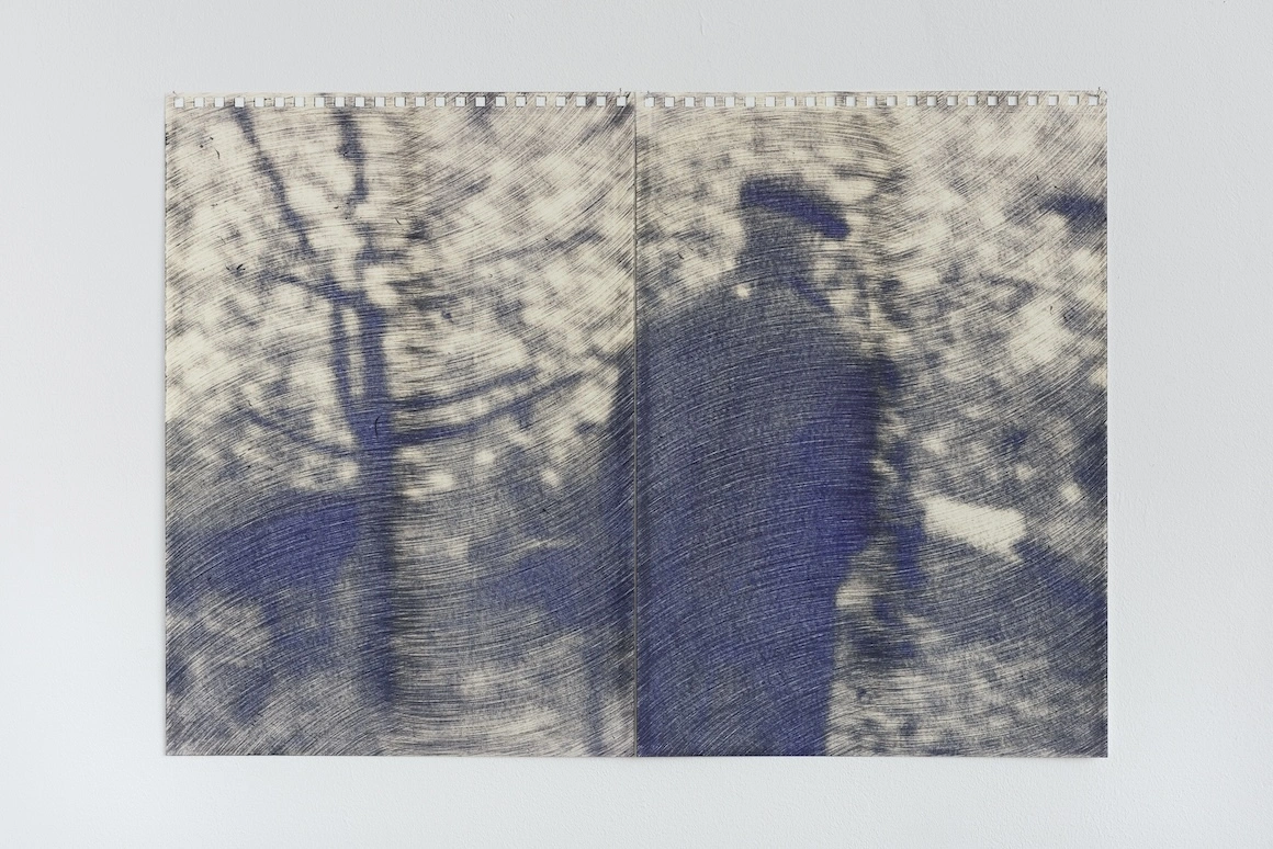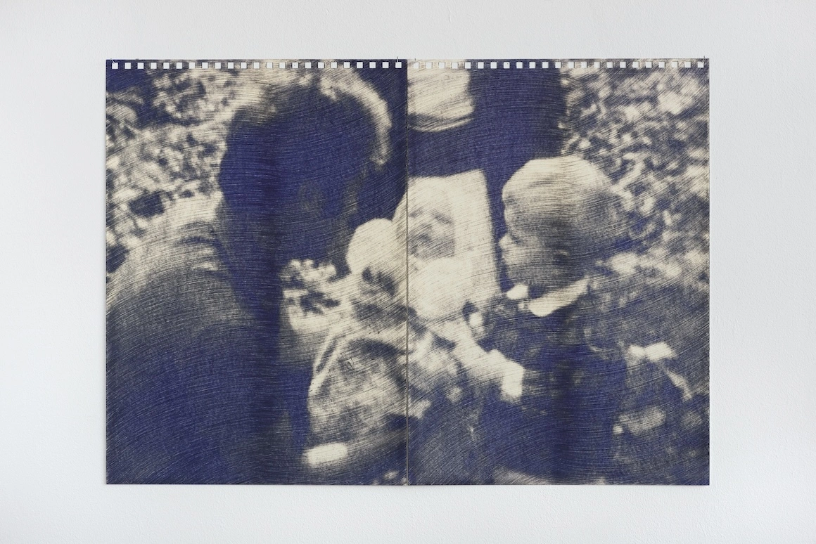 Fotografie principală: imagine stânga - Răzvan Anton, Fading Study (hand holding a photograph, negative) & imagine dreapta - Răzvan Anton, Fading Study (hand holding a photograph), 2024, pix albastru pe hârtie perforată, 126 x 90 cm © Alexandru Paul