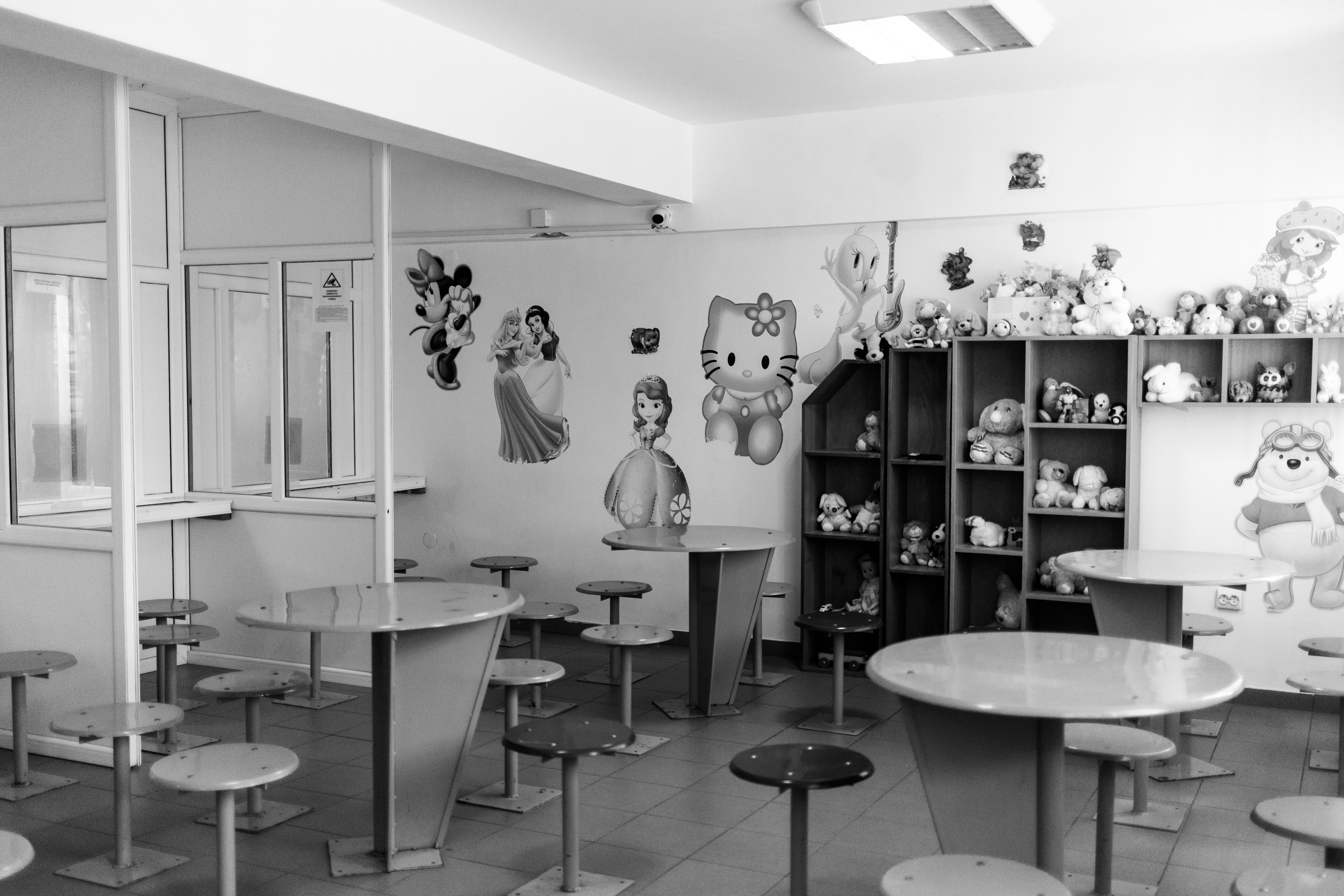 Uneori, vizita se desfășoară într-o sală cu mese și cu scaune rotunde, cu pereții pictați cu personaje din desene animate. Alteori, fiecare stă pe partea lui de realitate, despărțiți de un plexiglas sau de un ecran, în cazul vizitelor online.