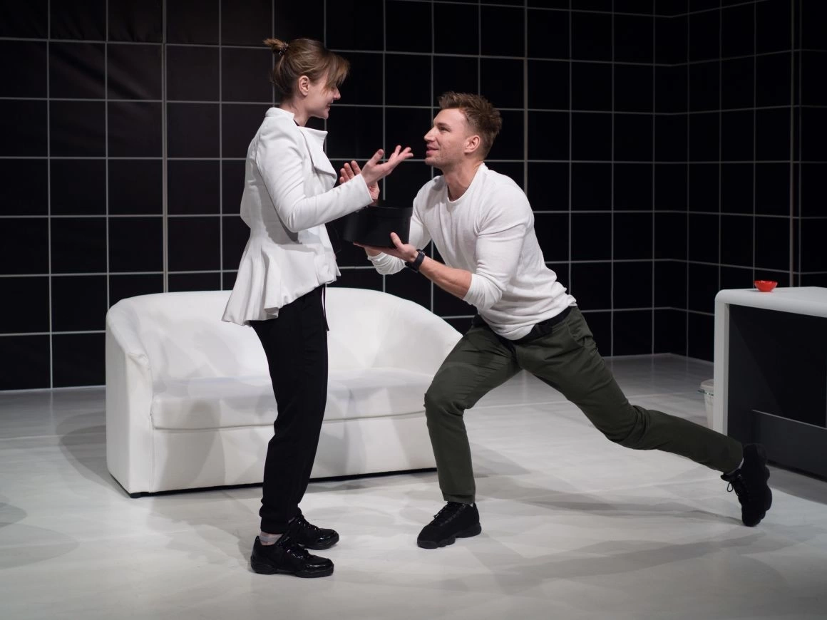 Denisse Moise e organică, implicată și coerentă în stările pe care le interpretează. Olimpiu Blaj îmbină cu brio vulnerabilitatea personajului cu momentele sale de forţă, gestionând fără probleme intensităţile în scene precum cea a beţiei. Cu toate astea, în prima parte a spectacolului, înainte de explozia cazului Black Box, înainte ca cei doi să întâlnească adevărata criză, jocul lor e deosebit de matematic şi clar, fapt ce poate fi perceput ca nenatural. Tot în partea asta, când începem să-i cunoaştem pe Owen & Polly, când pătrundem puţin câte puţin în intimitatea lor, se simte și o lipsă de dinamism. Ea e salvată doar parţial de structura fragmentară a spectacolului. Scenele sunt intermediate de momente misterioase, cu lumini întunecate, difuze și cu vocea gravă din înregistrări a Anei Șusca, în care fie ni se dezvăluie treptat ce înseamnă Black Box, fie suntem provocați să răspundem la întrebări majore precum „Ce este realitatea?”. Constanta impusă de această convenţie (justificabilă prin faptul că acţiunea se întinde pe o perioadă îndelungată de timp) este pe de o parte benefică - accelerează ritmul spectacolului -, dar, pe de alta, aduce cu sine un grad de predictibilitate.