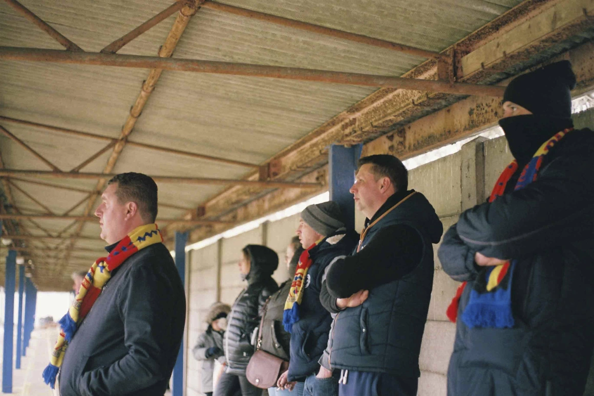 Ionuț are vreo 40 de ani și privirea blândă, iar părul grizonant și cearcănele îi dau o înfățișare hotărâtă. Pare că are emoții înainte de meci. Îi propun un interviu la final de partidă, dar mă avertizează ca s-ar putea să fie nervos și să bată câmpii dacă echipa pierde. Se mai joacă cinci meciuri în sezon care vor hotărî dacă echipa se menține în eșalonul 8, îmi explică Ionuț. Îmi zâmbește totuși și mă îndrumă spre suporterii FC România. De la distanță, disting doar câțiva suporteri cu fulare tricolore.