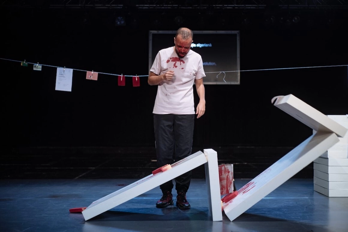 O altă perspectivă politică apare în Koulounisation, concept și interpretare Salim Djaferi, un artist francez de origine algeriană care discută aici despre colonizarea Algeriei de către Franța prin intermediul etimologiei cuvântului „colonizare” în limba arabă. Investigând diferitele expresii prin care se exprimă în arabă conceptul de colonizare, performerul dezbate statutul cetățeanului colonizat în patria colonizatoare, raporturile de putere politică între cele două țări și cele la nivel individual, rasismul și relațiile de dominație etc. Fiecare expresie identificată pentru a defini colonizarea are niște nuanțe specifice, între ele există una care înseamnă invadarea spațiului de cineva care vine la tine acasă, îți rearanjează lucrurile, ocupă din ce în ce mai mult loc până te obligă să pleci. Este uimitor ce reușește să facă actorul cu puține (și ieftine) elemente de recuzită (câteva plăci de polistiren, o sfoară, cuie, un burete). Deconstrucția cuvintelor este asociată unor acțiuni scenice constructive. Djaferi își construiește un spațiu, îl delimitează, îl locuiește, și-l asumă. Din când în când, el o invită pe una dintre asistentele din staff-ul tehnic (asta ne face el să credem, iar jocul ei natural susține iluzia) să îl însoțească într-o demonstrație. Doar că pe măsură ce spectacolul se derulează, intervențiile asistentei devin tot mai dezinvolte până când ea preia inițiativa, rearanjează spațiul și îl obligă pe Djaferi să se închidă într-o celulă de polistiren. O excelentă demonstrație verbală și performativă a colonizării și un exemplu revigorant de teatru minimalist estetic (sărac conform teoriilor lui Grotowski), dar bogat conceptual.