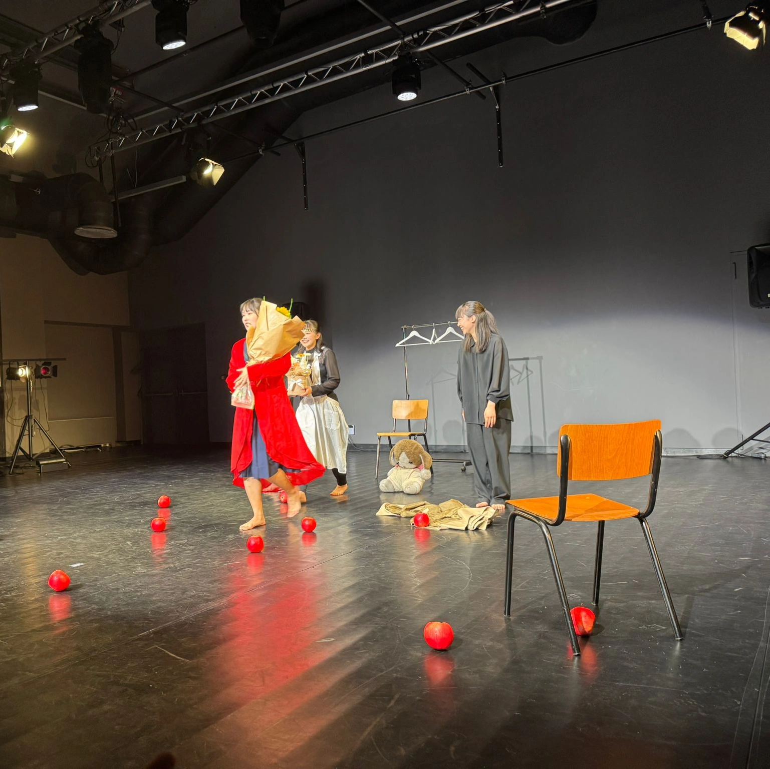 După-amiază, am mers să văd pe scenă tovarășii de drum cu care am parcurs distanța București-Sibiu săptămâna trecută, trupa de studenți la actorie a Universității Nihon, cea mai mare și mai diversă din Japonia, unde învață peste 500 de oameni teatru. Spectacolul lor, Dulce Teroare. Al Treilea Vis, împărtășește fragmente din experiența autoarei piesei, Mitu Murakami, care are doar 20 de ani, de a crește cu o mamă obsedată de corp și înfrumusețare, prin cadrul basmului Alba-ca-Zăpada. În mare, spectacolul mi-a adus aminte de cum scriam eu în studenție, însă mi-am dat seama că habar nu am cum să judec jocul actoricesc, din cauza diferenței de ritm și tonalitate a japonezei față de română. O scenă culminantă a spectacolului de 40 de minute a fost coșmarul în lumini roz al protagonistei, în care ea încerca să cânte (nu foarte bine, dar sincer), iar vocea îi era tot mai acoperită de râsul diabolic al celorlalte trei personaje de pe scenă, îmbrăcate în negru și cocoțate pe scaune.