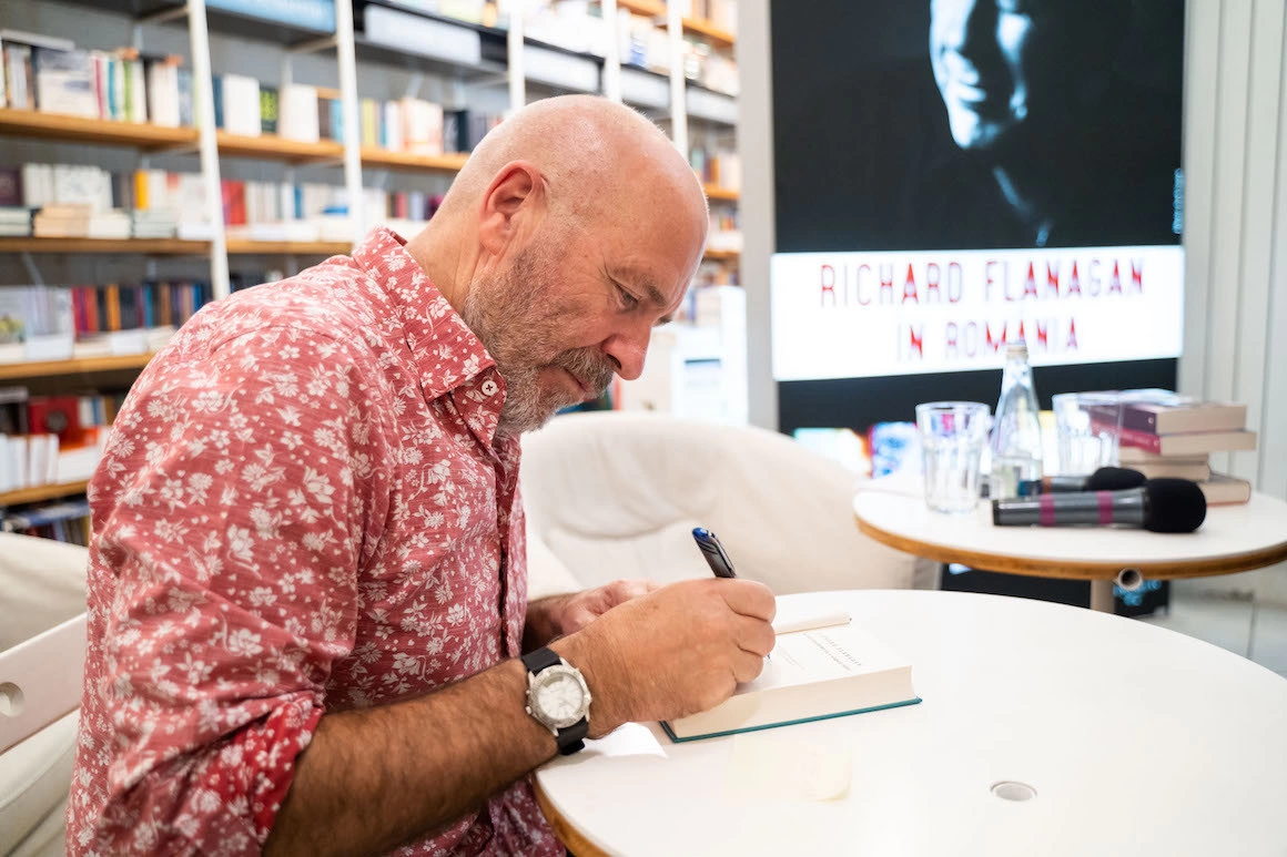 La invitația Editurii Litera, Flanagan a venit recent în România, unde a participat la câteva întâlniri cu cititorii la București și Sibiu. M-am întâlnit cu el într-o dimineață înnorată și am băut o cafea turcească în Centrul Vechi, iar apoi am fost să mâncăm la un restaurant unde se auzeau romanțe și unde eram înconjurați de carpete cu Răpirea din serai. Am vorbit despre romanele lui, despre relația cu tatăl lui, despre jurnalism & Tasmania, dar și despre cum e să fii călăuză pe râu.