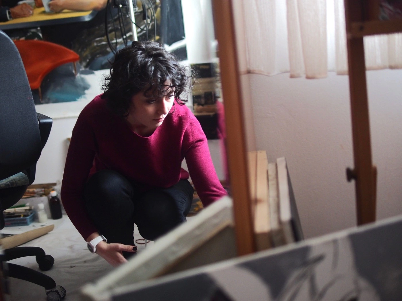 Până atunci lucrase în atelierul Universității de Artă și Design, secția de Pictură, care e chiar în mijlocul Parcului Central din Cluj, sau acasă. Instalată în noul atelier, a observat că, odată cu intimitatea unui spațiu doar al tău, vine și libertatea să experimentezi, să stropești. Și-a luat inima în dinți și a început să exploreze pictura figurativă, față de care avea unele reticențe. „Consideram că e o zonă în care poate că am probleme de construcție când vine vorba de rigurozitatea asta anatomică”, spune Flavia. Proiectele ei dinainte erau într-o zonă mai abstractă. Dar a descoperit că nu o deranjează să încerce chestii care poate vor fi eșecuri. Și-a asumat că asta e parte din procesul ei creativ.
