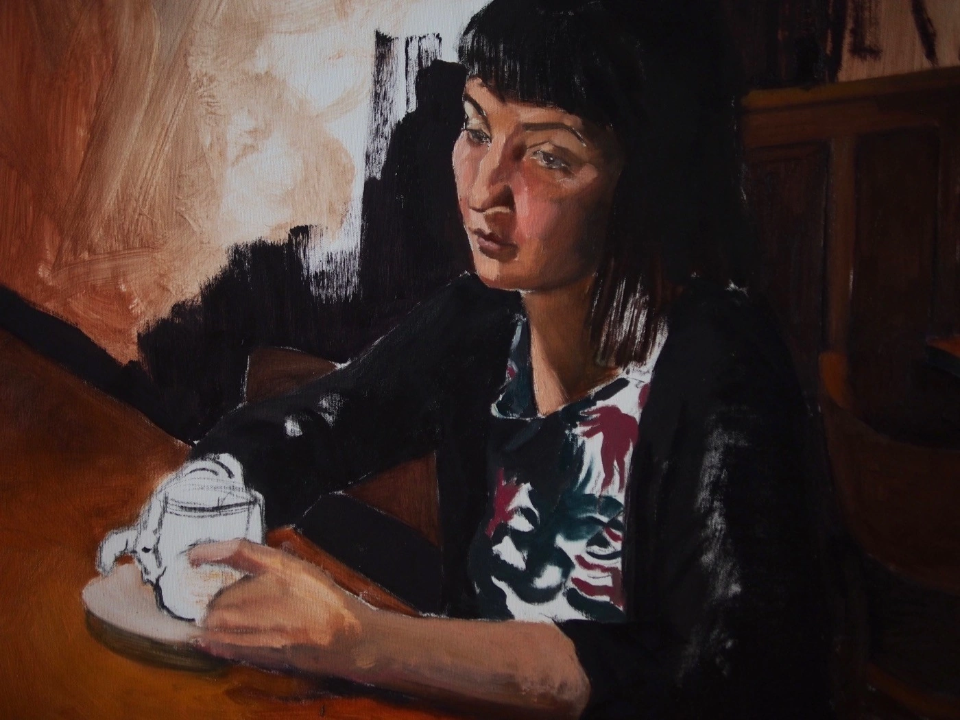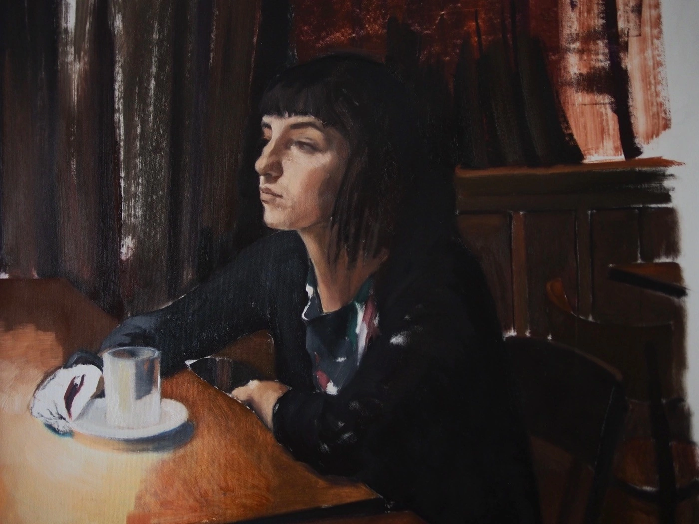 Multe dintre lucrările din camera ei înfățișează femei într-o cafenea sau un bufet, care par prinse într-o așteptare fără obiect. Aici văd asemănarea cu Hopper. Starea aceea în care nu știi dacă un om tocmai a ajuns într-un loc sau e pe cale să plece.