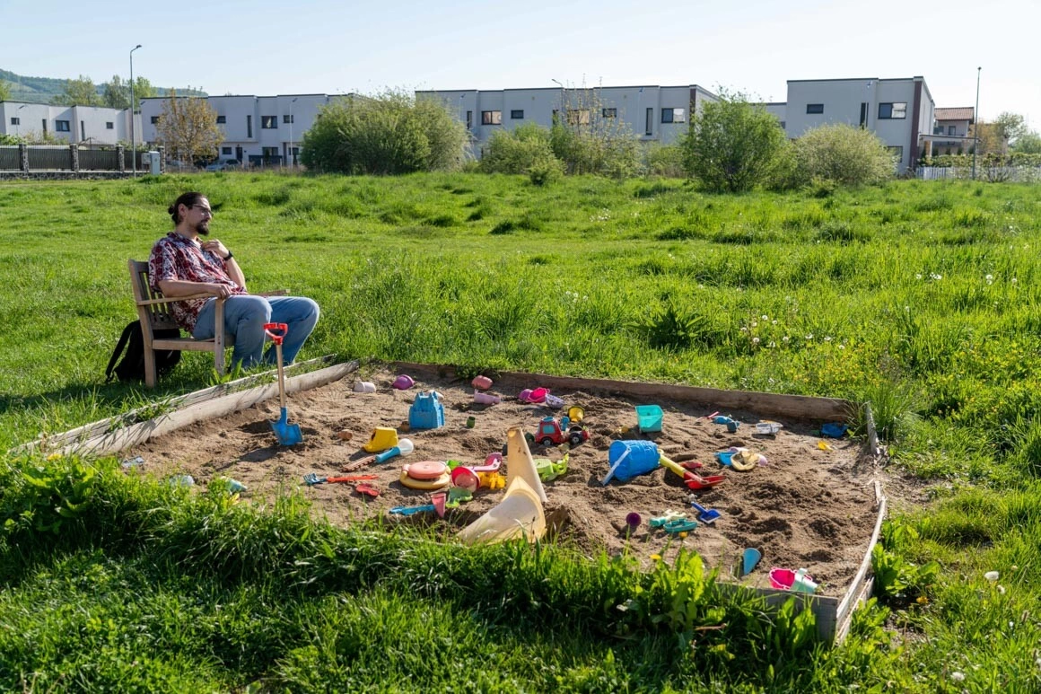 Ne întoarcem și dăm de blocuri noi, construite acum vreo jumătate de an. „Astea erau singurele din zonă cu 1.000 pe metru pătrat. Acum sunt, evident, 1.500 pe metru pătrat”, ne spune Flo. Zonele dintre blocuri sunt parcări pavate, ce se întind până sub geamuri. Locatarii au încercat să convertească ce rămâne pe mijloc într-un soi de spațiu public: din niște paleți au făcut bănci, iar pe lângă ele trec seara copii pe triciclete.