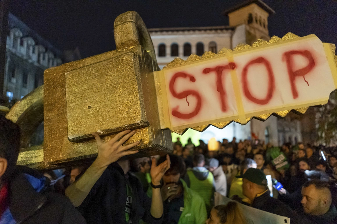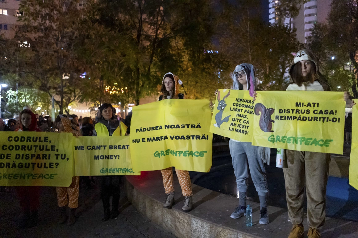 Ministerul, ca la orice alt protest, a rămas sumbru, mut și profilat în întuneric pe cerul de noiembrie, impasibil la marele banner Greenpeace proptit chiar sub ochii lui: „Vrem SUMAL, nu lemn ilegal!”