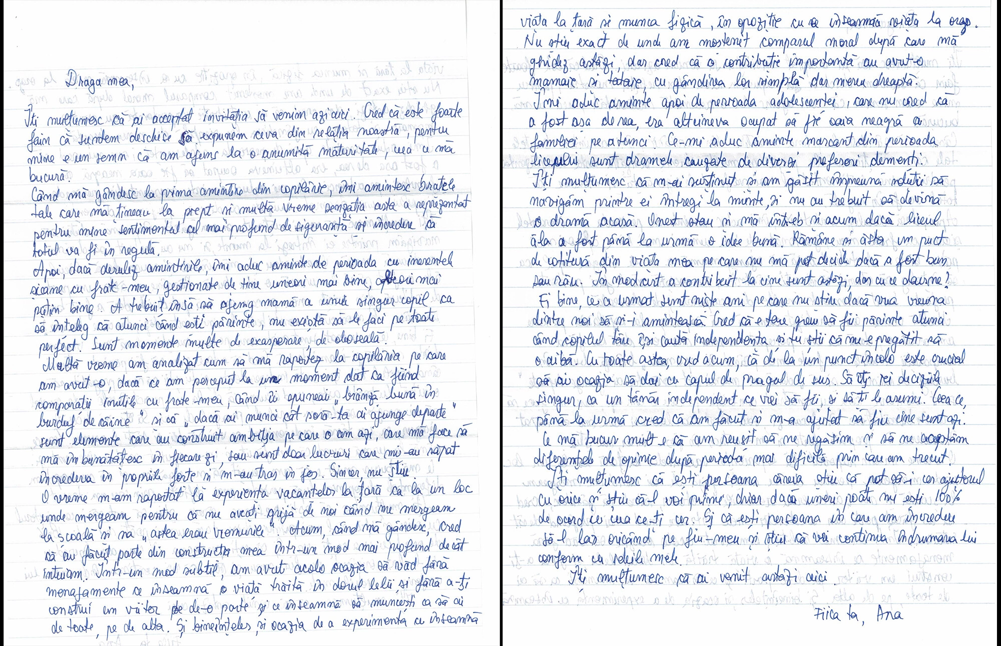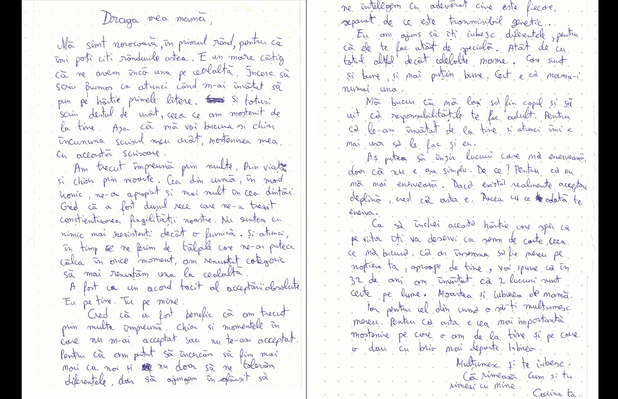 Nu mi-e ușor să îți scriu aceasta scrisoare. Nu-mi amintesc să o fi făcut nici în copilărie de ziua mamei. Cred ca vederile cu textul lor scurt și la obiect sau discuțiile lungi la o cafea sunt mai degrabă stilul meu, dar voi încerca. Îmi amintesc ca la un moment dat în copilărie am dat peste niște scrisori ale tale, unele pentru tata, unele pentru prietenii tăi prin corespondență care te ajutau să înveți limba engleza și știu exact ca m-am gandit “mama are talent la scris. Oare mai scrie?” Mai scrii? Cred ca mi-ar plăcea sa te citesc. Poate ne facem un obicei din a ne scrie. Cum ți se pare ideea?