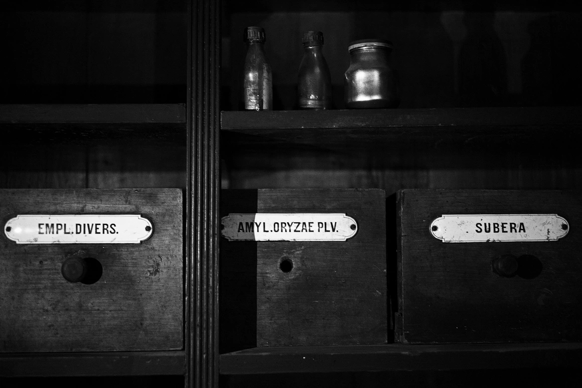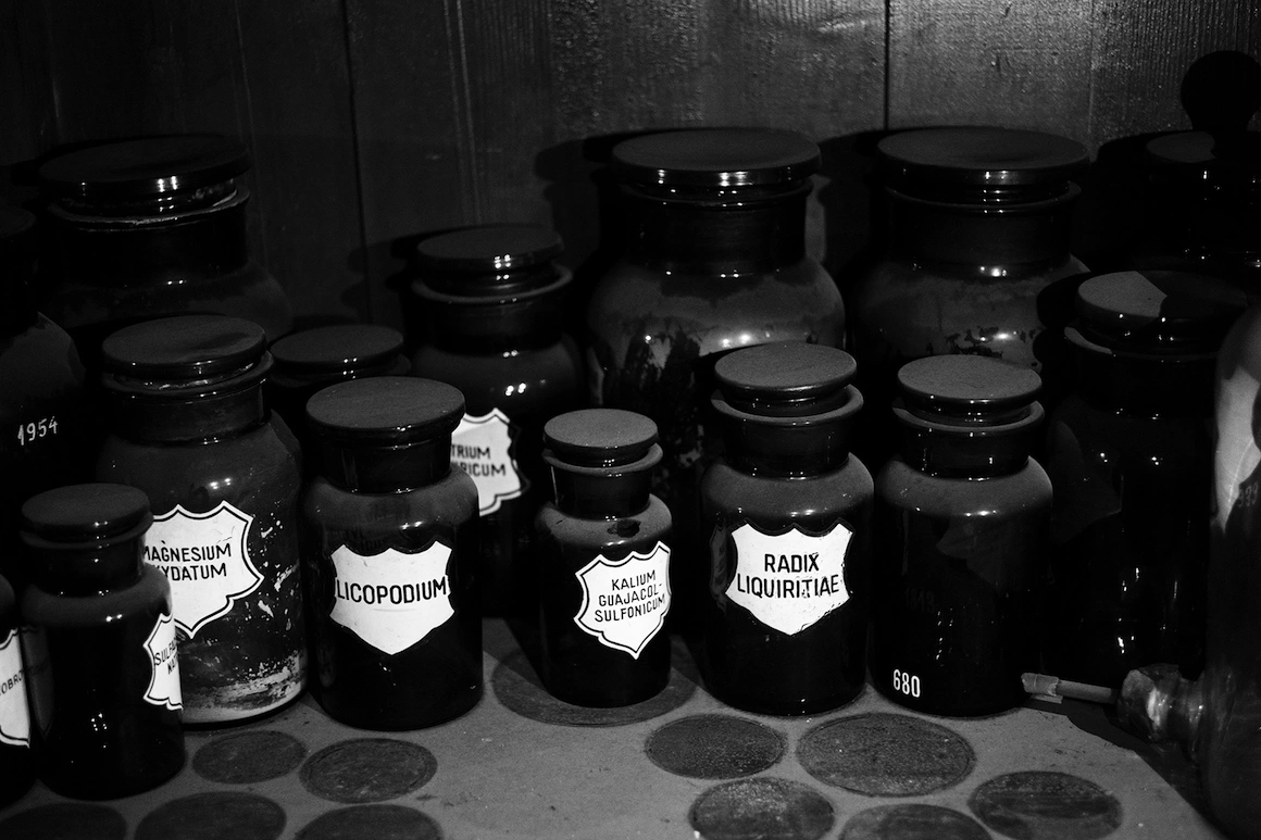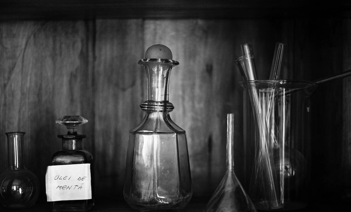 Locul, cu toate ale lui, e excelent conservat. Poate și pentru că s-au perindat pe-aici numai farmaciști, oameni care au tratat cu respect varianta veche a lumii lor. Acum, toate obiectele ce țin de farmacie se vând odată cu imobilul. Pe rafturi mai sunt borcănașe colorate cu urme de prafuri și etichete scrise de mână, pe limba comună a farmaciștilor și a profesorilor de la Hogwarts: kalium chloratum, kalii guajacolsulfonas, radix liquiritiae, în preajma unui explicit ulei de mentă.