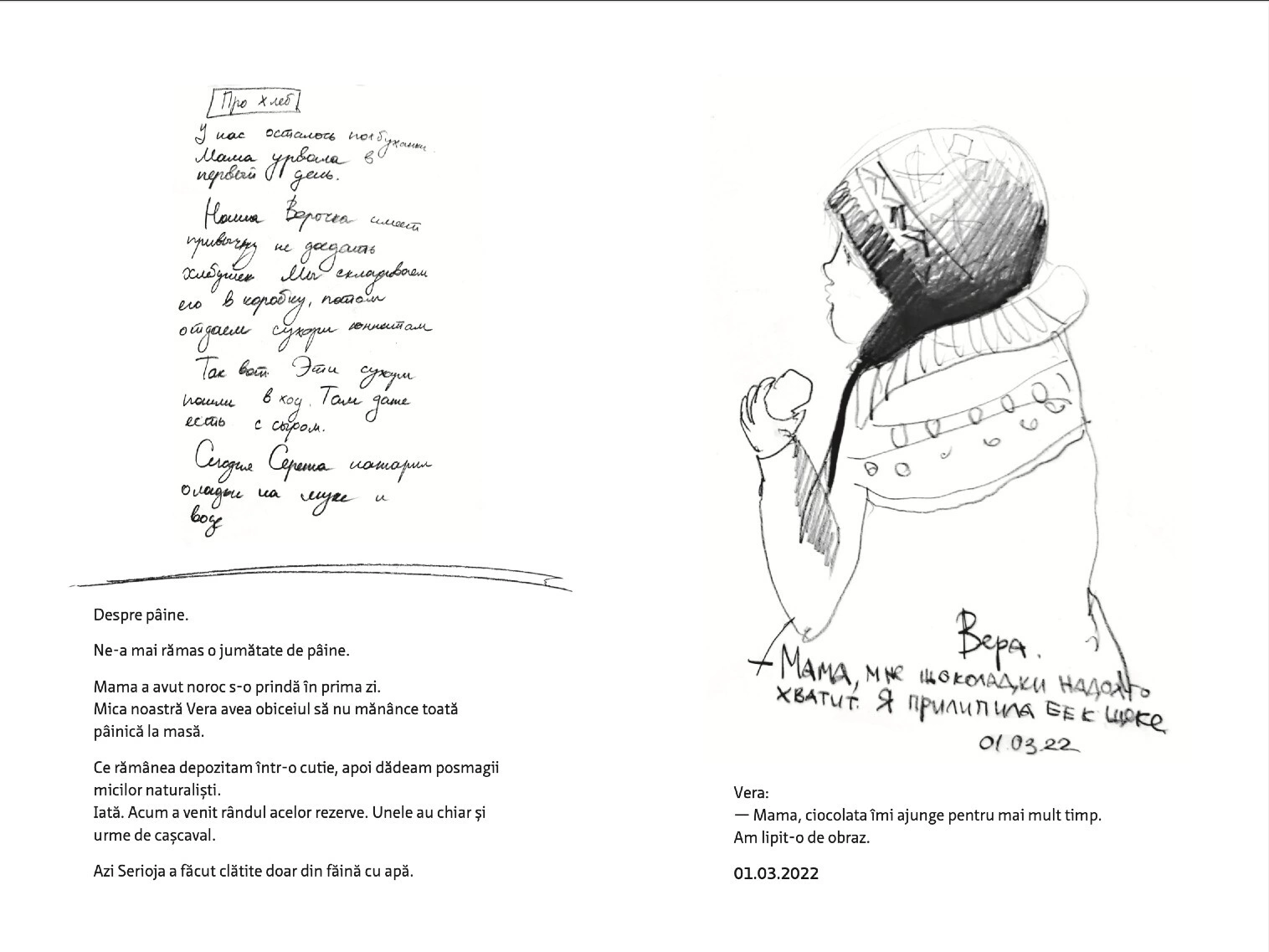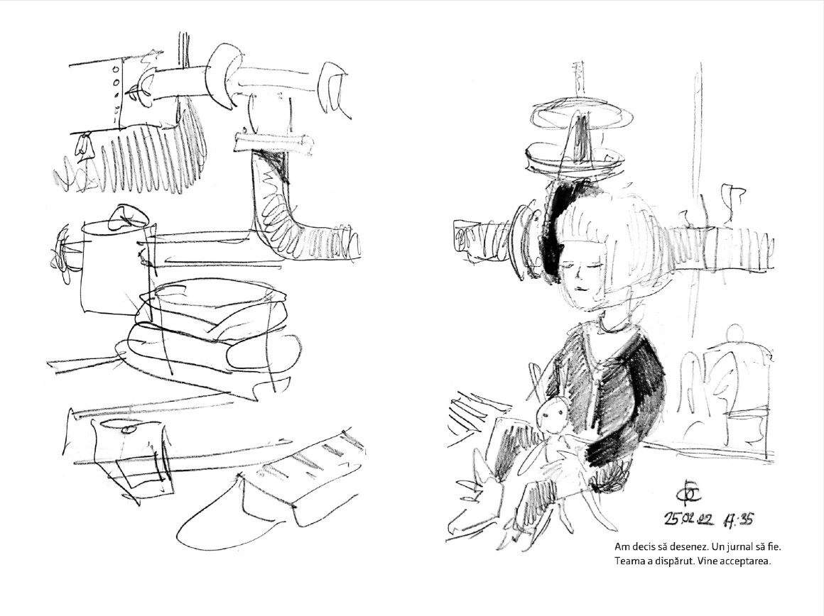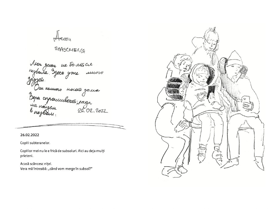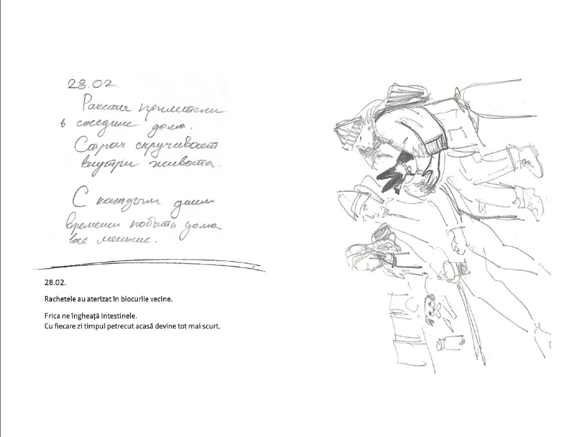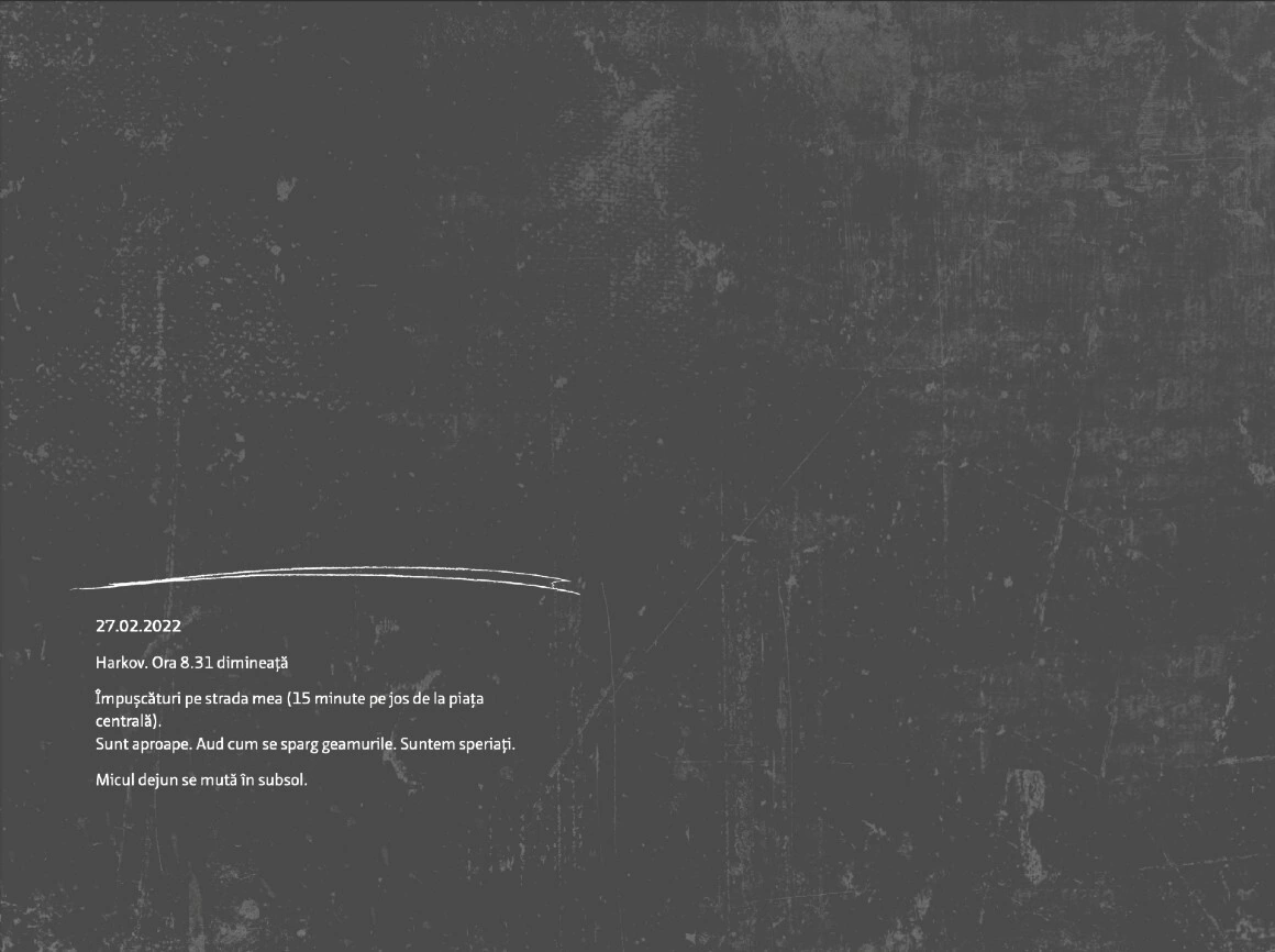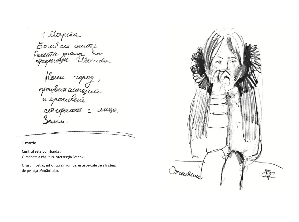 Citește mai jos, în premieră, fragmente din jurnalul scris și ilustrat de Olga Grebennik în cele 8 zile din februarie și martie pe care le-a petrecut într-un subsol din orașul ei, Harkiv. „Desenul a devenit singura portiță către lumea mea interioară care din afară era bombardată de avioane”, scrie Olga. „Toată frica mea o revărsam pe hârtie. (...) Lumea se dărâma, iar eu în ciuda războiului mă ocupam cu creația. Ca să supraviețuiesc. Acest caiet era firul de ață de care mă agățam cu toată forța.”
