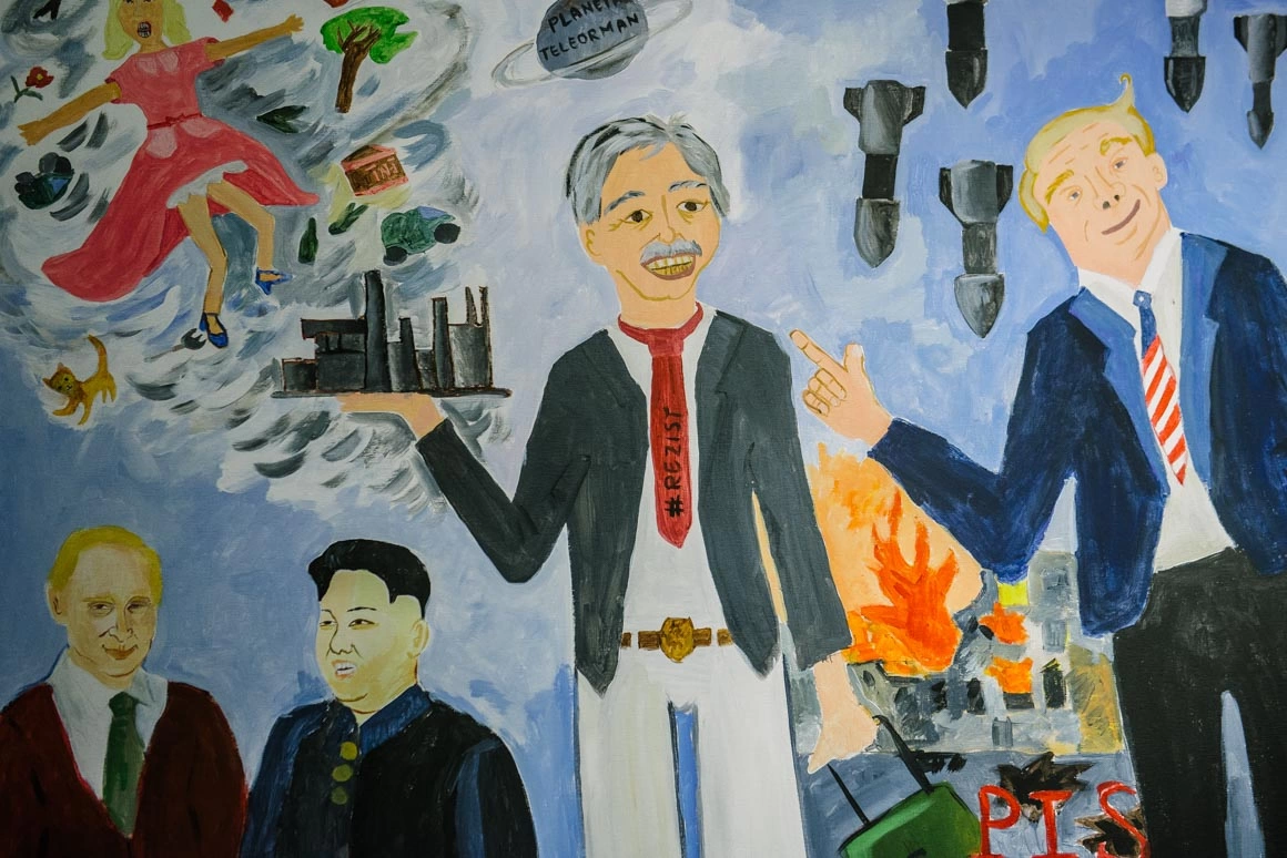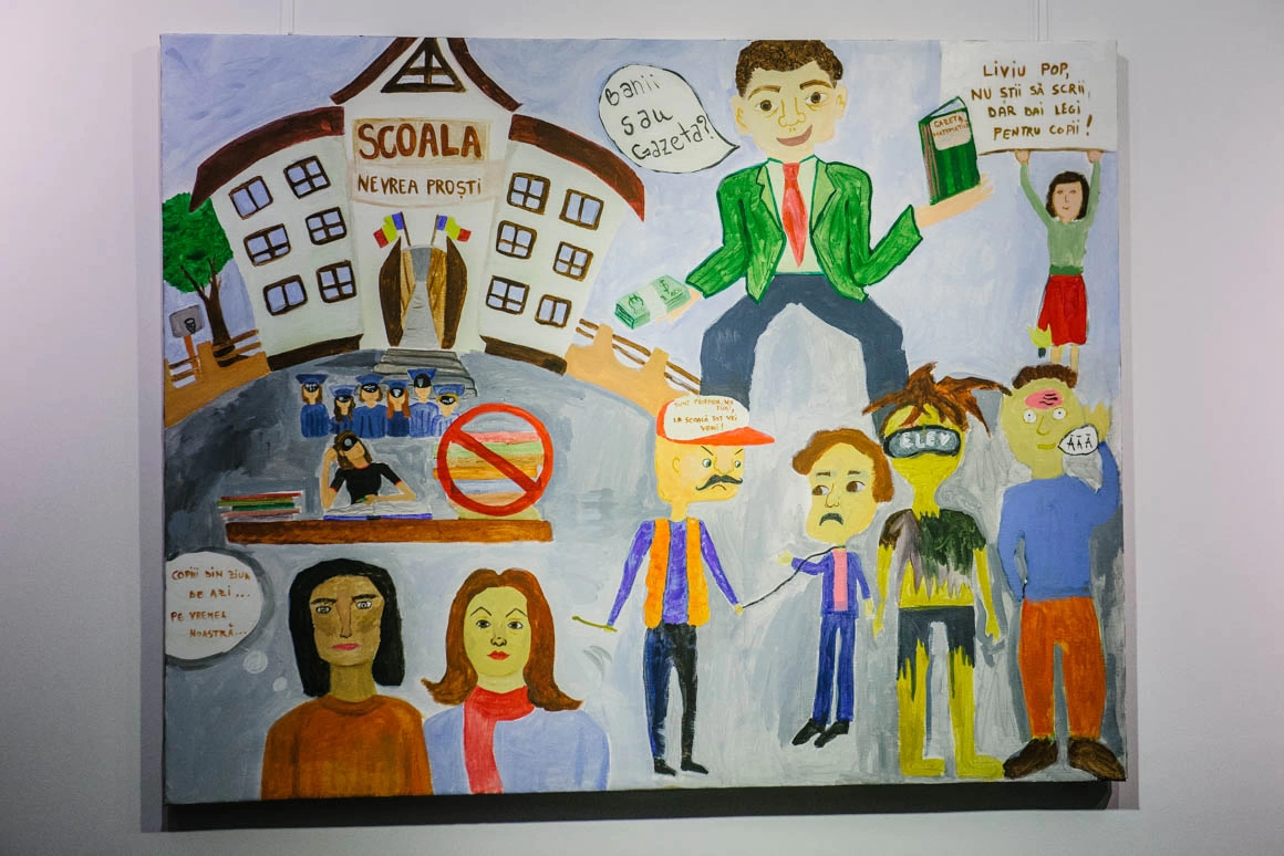 La Galeria Romniceanu expun tineri artiști cu vârste cuprinse între 5 și 14 ani. Pentru expoziția de față, copiii au fost invitați să-și picteze lumea. A ieșit un caleidoscop în care încap și Liviu Pop și minionii și Donald Trump și unicornii, plus căței, pisici și alte animăluțe de prin case.