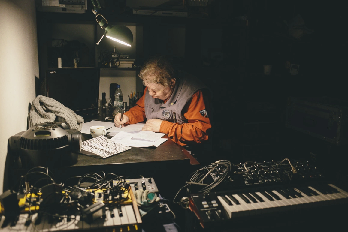 Florian Lungu în bârlogul lui, fotografiat de Ioana Cîrlig în timp ce-și scrie de mână prezentările artiștilor:
