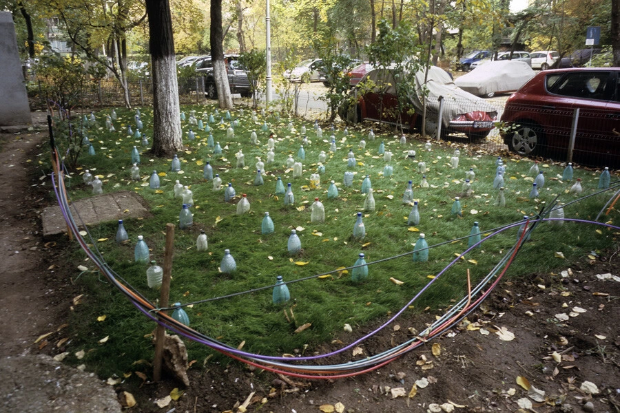 A început proiectul când era la facultate, inspirat de grădinile în care locatarii blocurilor își etalau creativitatea și nevoia lor de verdeață și de lucru cu pământul, nevoie care, dacă stai într-o clădire de 10 etaje, e cam greu de potolit altfel. În peticele dintre blocuri care au scăpat fără să fie transformate în parcări, oamenii își extind spațiul privat în spațiul public și creează spații hibrid în care se exprimă cu multă pasiune.