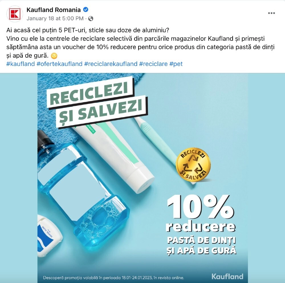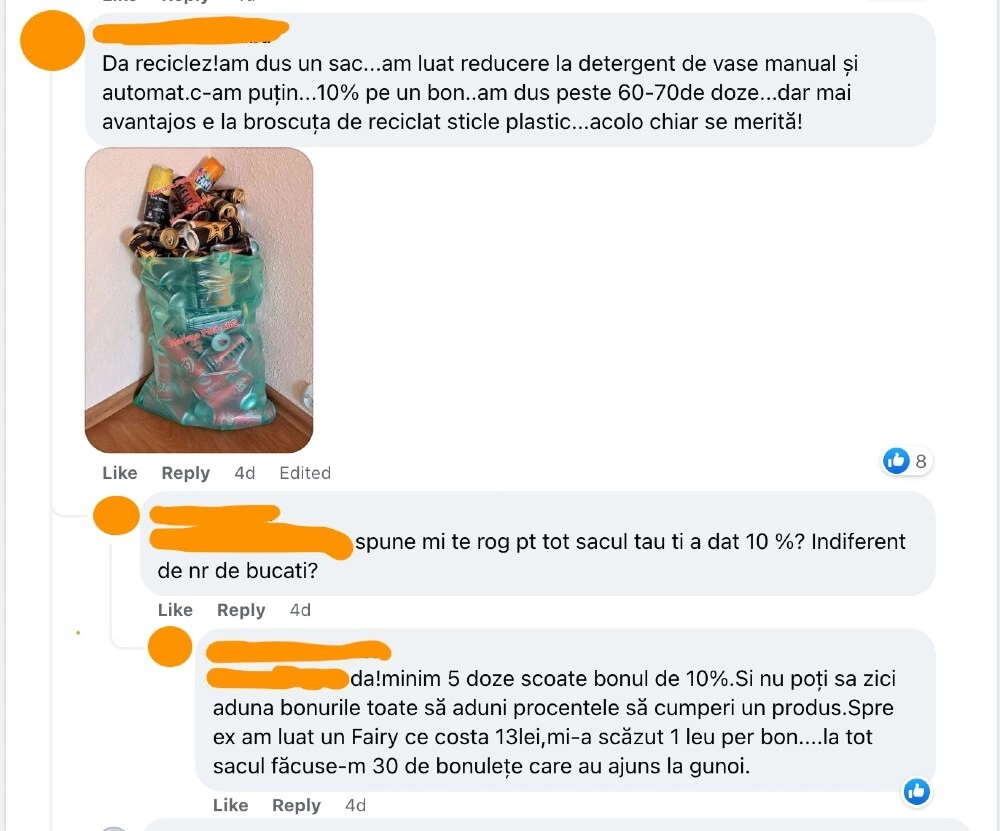În captura de ecran de mai jos, un exemplu de supermarket care încurajează cetățenii să predea deșeuri în schimbul unor cupoane de reducere. Una dintre clientele care au vrut să beneficieze de program a predat un sac de deșeuri, dar a obținut o singură reducere de 10% și a aruncat alte 30 de bonuri la gunoi.