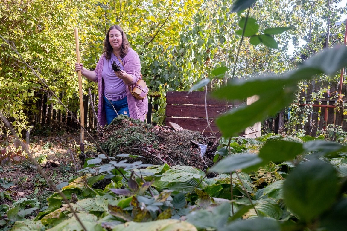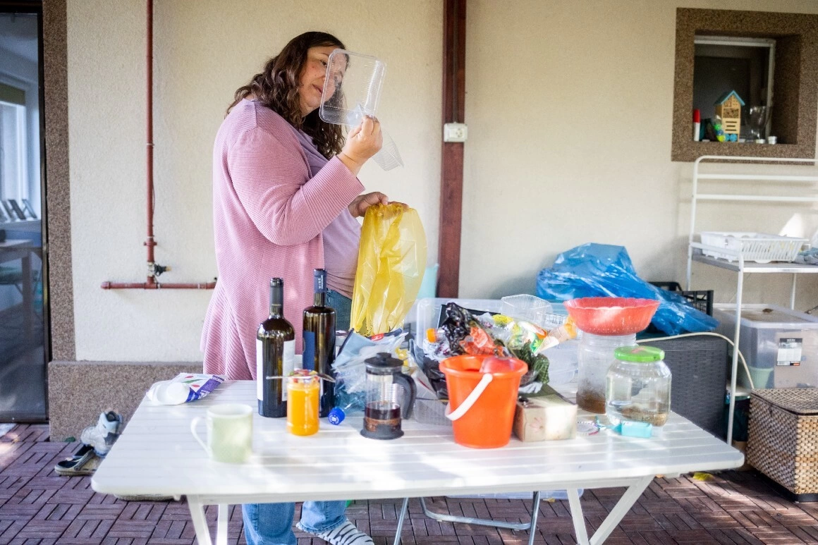 După ce spală și golește ambalajele, Tea se pregătește să meargă la Lidl. Înainte de a ieși din curte, trece însă pe la cubul din lemn în care strânge compost. Învârte materia de acolo, să se aerisească. Apoi, iese din curte cu pungile pregătite cu deșeurile pentru reciclat.