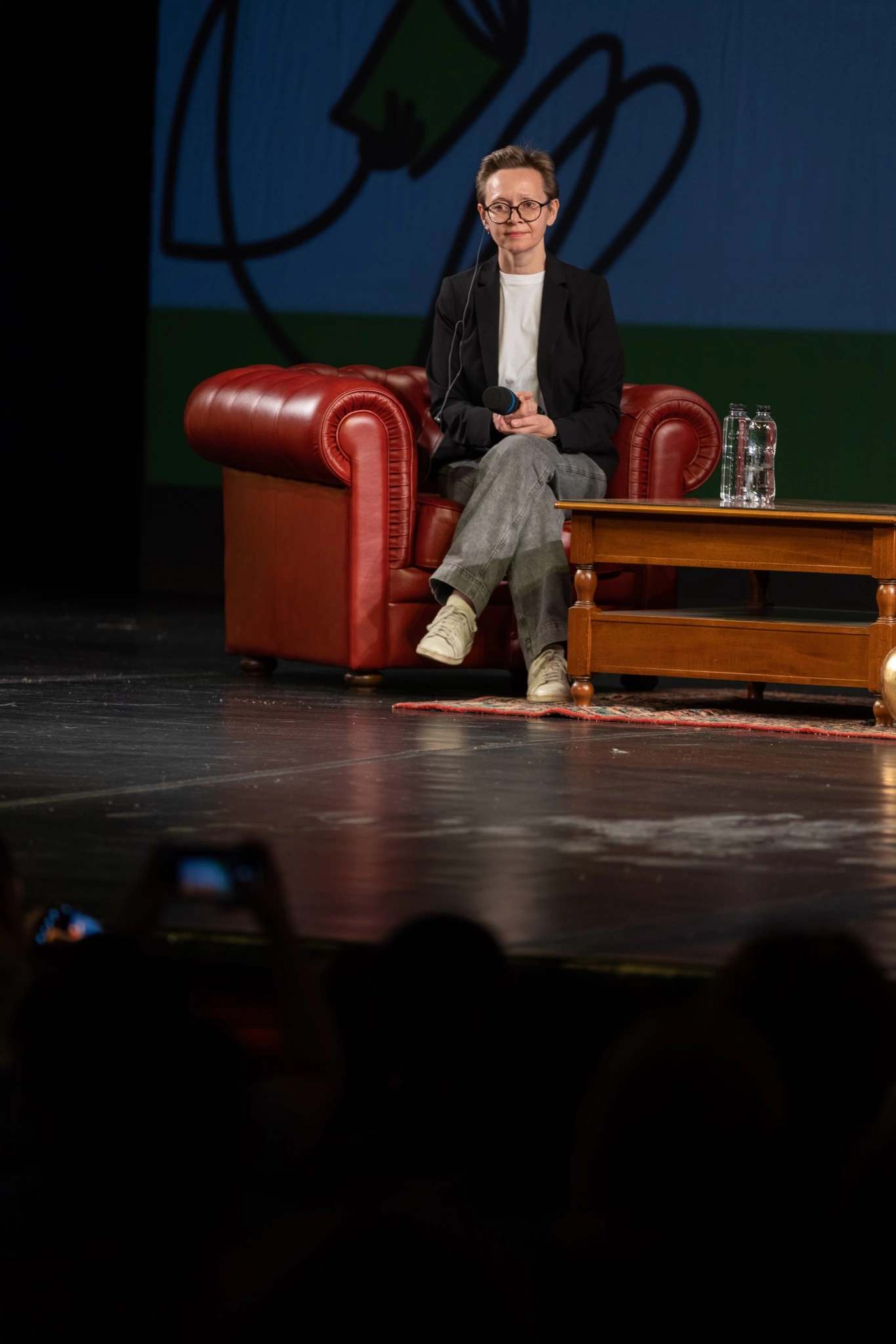 Am văzut-o prima oară la micul dejun – la 7:30 dimineața eram doar noi două în sala de mese a hotelului. S-a așezat singură la masă și n-a folosit telefonul cât timp a mâncat. Am revăzut-o la finalul primei seri de FILIT, pe scena Teatrului Național „Vasile Alecsandri” din Iași, într-o discuție cu jurnalistul Marius Constantinescu. A vorbit acolo despre mecanismele pe care oamenii le folosesc pentru a se proteja de trauma colectivă a războiului și despre izolarea Rusiei din prezent, care poate da naștere dezumanizării. „Literatura este un instrument al compasiunii” a fost citatul care a răsunat în sală și care a trezit în mine, viitoare psihologă, mult interes să stăm de vorbă. Mi-a dat impresia că privește natura umană cu empatie, înțelege cât de complexă e mintea noastră și face apel la bunătate. Când i-am luat interviul, a zâmbit rar, mai degrabă cu blândețe decât cu bucurie sau entuziasm, a vorbit pe un ton scăzut, mereu prudentă și atentă la cuvinte. M-a rugat încă de la început să nu folosim termenul război, chiar dacă abordăm subiectul.