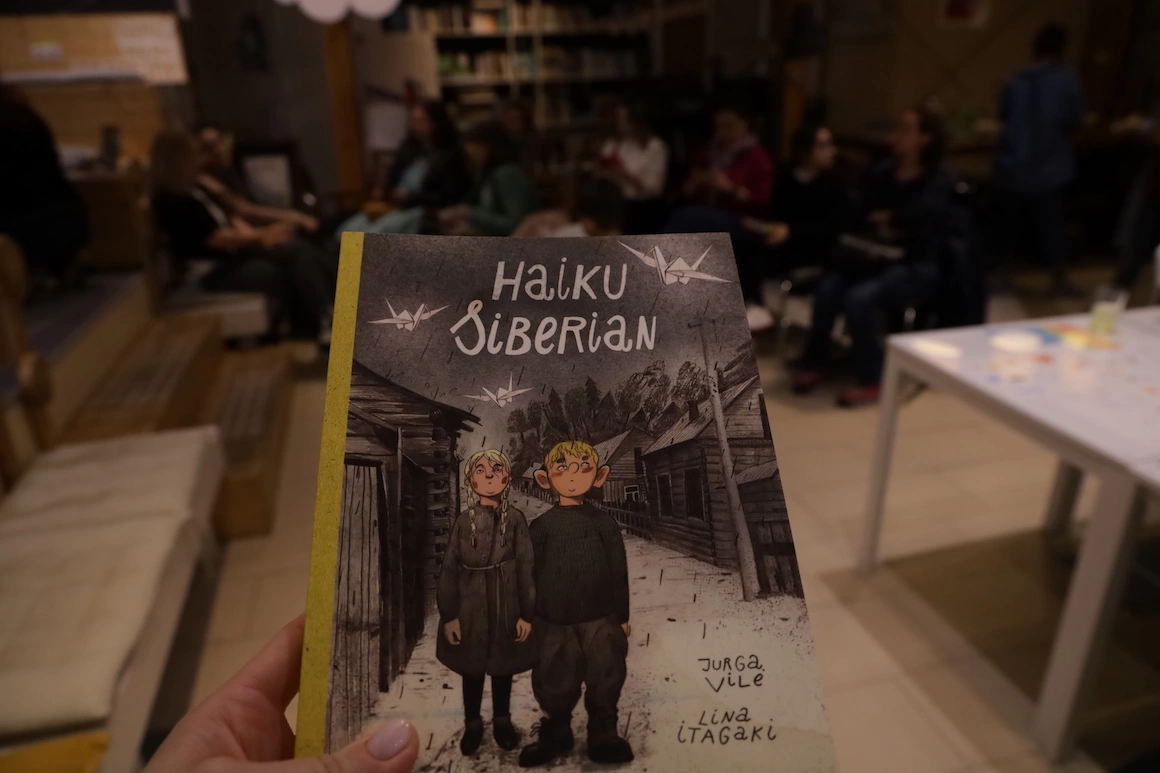 Într-o seară friguroasă de noiembrie, Jurga Vilė și Lina Itagaki se îndreaptă spre librăria Seneca Anticafe, unde le așteaptă cititorii cărții Haiku Siberian. Jurga este îmbrăcată într-o rochie gri, pe când Lina are un hanorac roșu.