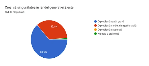 Ce ne-a atras atenția încă din start este că majoritatea respondenților (63,6%) consideră singurătatea drept o problemă reală și gravă în rândul generației lor. Acest lucru indică o formă de conștientizare afectivă și generatională a unei stări care depășește granițele intimității. Totodată, 86% dintre participanți au resimțit lipsa companiei altor persoane: 43.5% dintre ei au resimțit-o des sau aproape întotdeauna, iar 42,9% au resimțit asta uneori. Lipsa conexiunilor calitative sau cantitative e prelungită și în contextele profesionale sau școlare: mai mult de jumătate dintre ei (52,6%) se simt singuri la școală sau job.