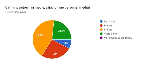 Participanții la studiu petrec un timp considerabil în mediul online: peste două treimi (66%) folosesc rețelele sociale între 1 și 3 ore pe zi, iar aproape un sfert (23%) depășesc cinci ore zilnic.