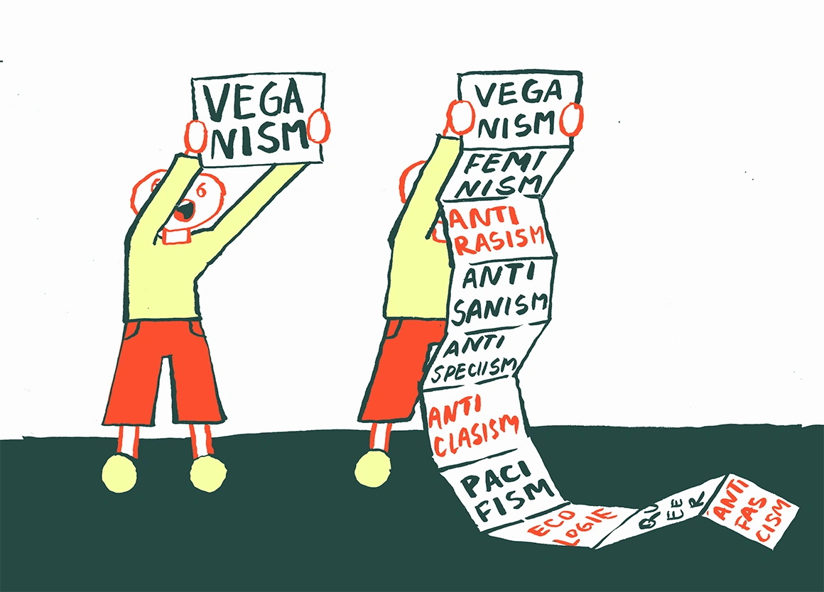 AK: Există mai multe filtre și în activism. Una-i să ieși în stradă într-un grup, alta-i să stai singur la un colț de stradă și să fi deschis dialogului. Sau alta-i să te duci în ferme și să filmezi sau să încerci să eliberezi animale. Sunt așa de multe lucruri pe care le poți face. Noi din toate astea, desenăm. Mergem la proteste și încercăm să ajutăm alți oameni, activiști, dându-le o altă dimensiune muncii pe care o fac.