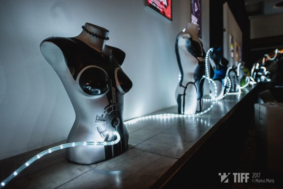 Pe o latură a holului de jos sunt busturi de manechine prinse cu cabluri de luminițe, care-i arată vizitatorului calea către diferite bucăți de InfiniTIFF. La etajul 1 a fost până alaltăieri Doom Room, o instalație realizată de o echipă daneză, ce a combinat realitatea virtuală cu cea fizică. La etajul 2, în mijlocul unei săli, o tânără cu o cască VR se învârte și tresare ca si cum ar ciupi-o cineva de umăr; din când în când culege nişte fructe invizibile din jur. O altă încăpere găzduiește proiecții în loop ale unor Youtube-uri realizate de vloggeri români. În cadrul unui workshop, 16 participanți au lucrat la producții proprii pe care le prezintă apoi de-a lungul ultimelor zile de festival.