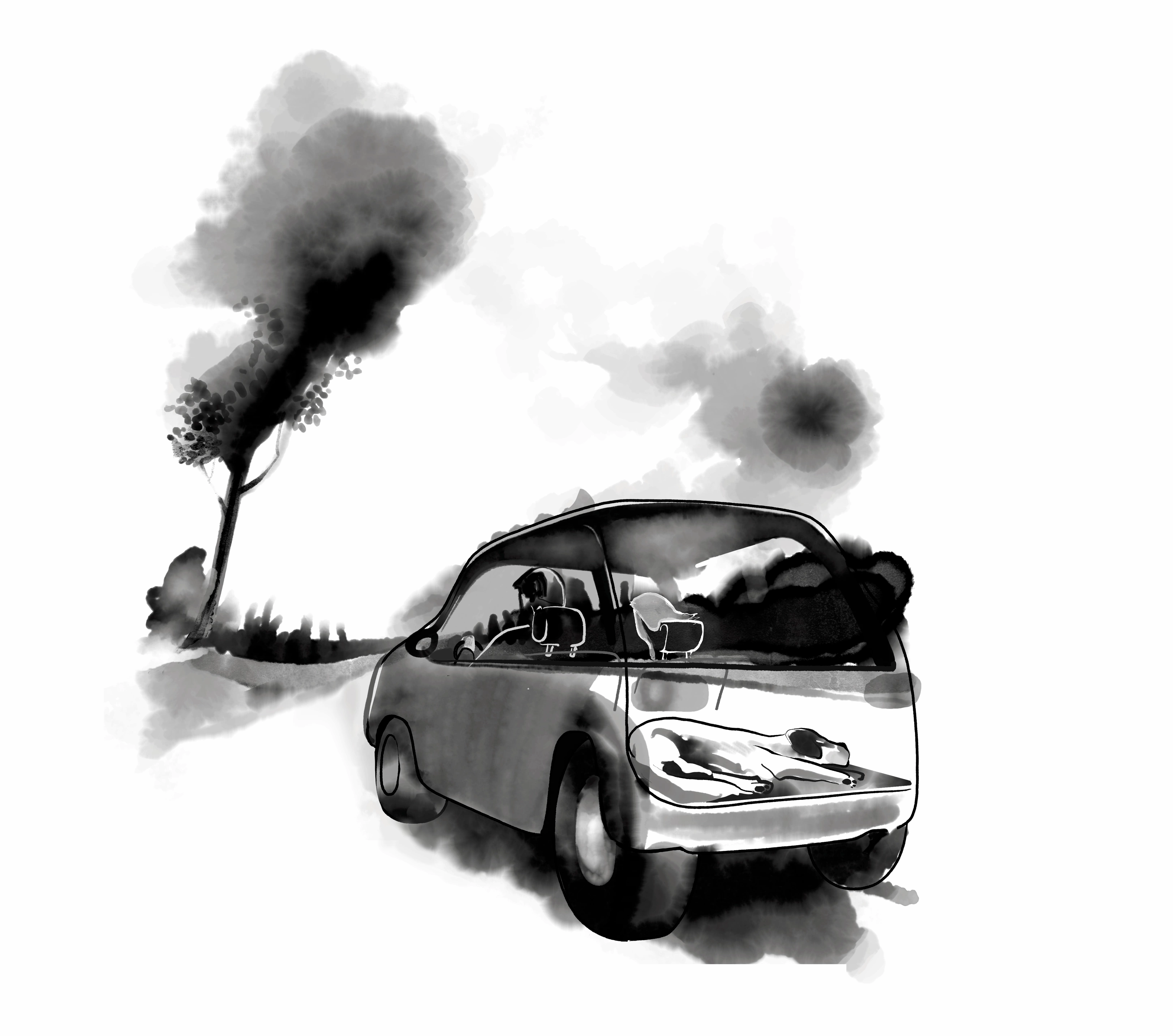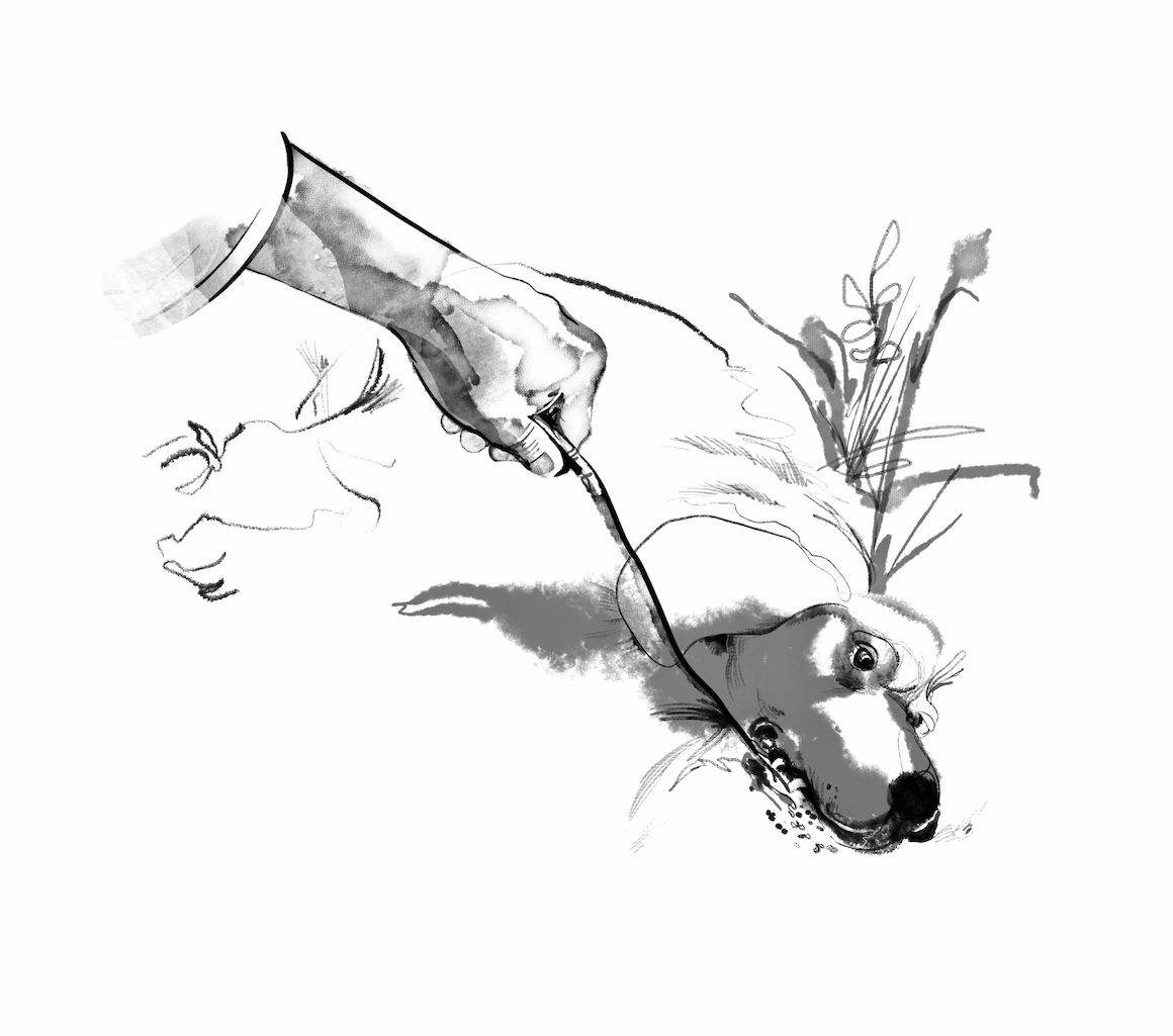 Tata îl sapă pe o targă improvizată din două prosoape vechi. Ridicați targa în portbagaj și crezi că dacă îl mai foiți mult, Câine se sfărâmă în fața voastră. Iese praf. Sigur o să supraviețuiască, doar a dat de voi și mergeți la veterinar. Intri cu Câine în portbagaj, îi picuri apă prin maxilarul moale, îl mângâi sperând că atingerea ajută, îi pui două degete în apropierea nasului să te asiguri că măcar respiră puțin.