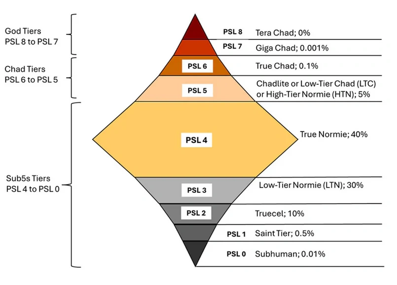 Sistemele de clasificare din comunitățile care-l urmăresc îndeaproape pe Clavicular sunt brutale. (Și, cum spuneam, comunitățile sunt adesea formate într-o proporție îngrijorătoare din oameni tineri și foarte tineri.) Dincolo de absurd, efectul clasificării este real: normalizează ideea că valoarea ta ca om depinde exclusiv de aspect. Scara de mai sus este sfântă în astfel de locuri online – și nu e singura. În comunități, oamenii uploadează poze și cer să fie rate-uiți: unii pentru validare, alții pentru că iau cu adevărat în serios demersul. Pentru a ascende trebuie întâi să știe de unde pleacă. Clavicular spune adesea că lui nu-i place să rate himself – să-și dea singur notă, dar am găsit și instanțe în care se autoplasează undeva la Chad. Din ce spune Clav, prin looksmaxxing poți urca una, cel mult două trepte pe această scară. Adică, de exemplu, un subhuman poate deveni cel mult truecel – cea mai pură formă de incel. Hey! Măcar nu mai e SUBHUMAN.