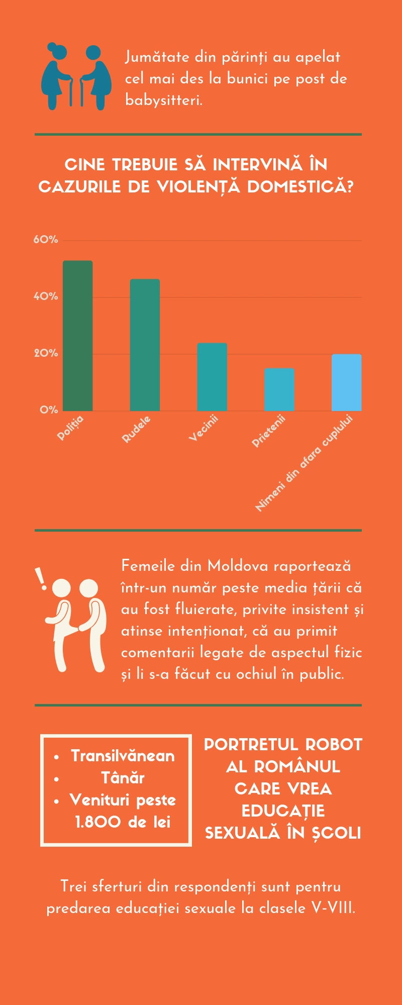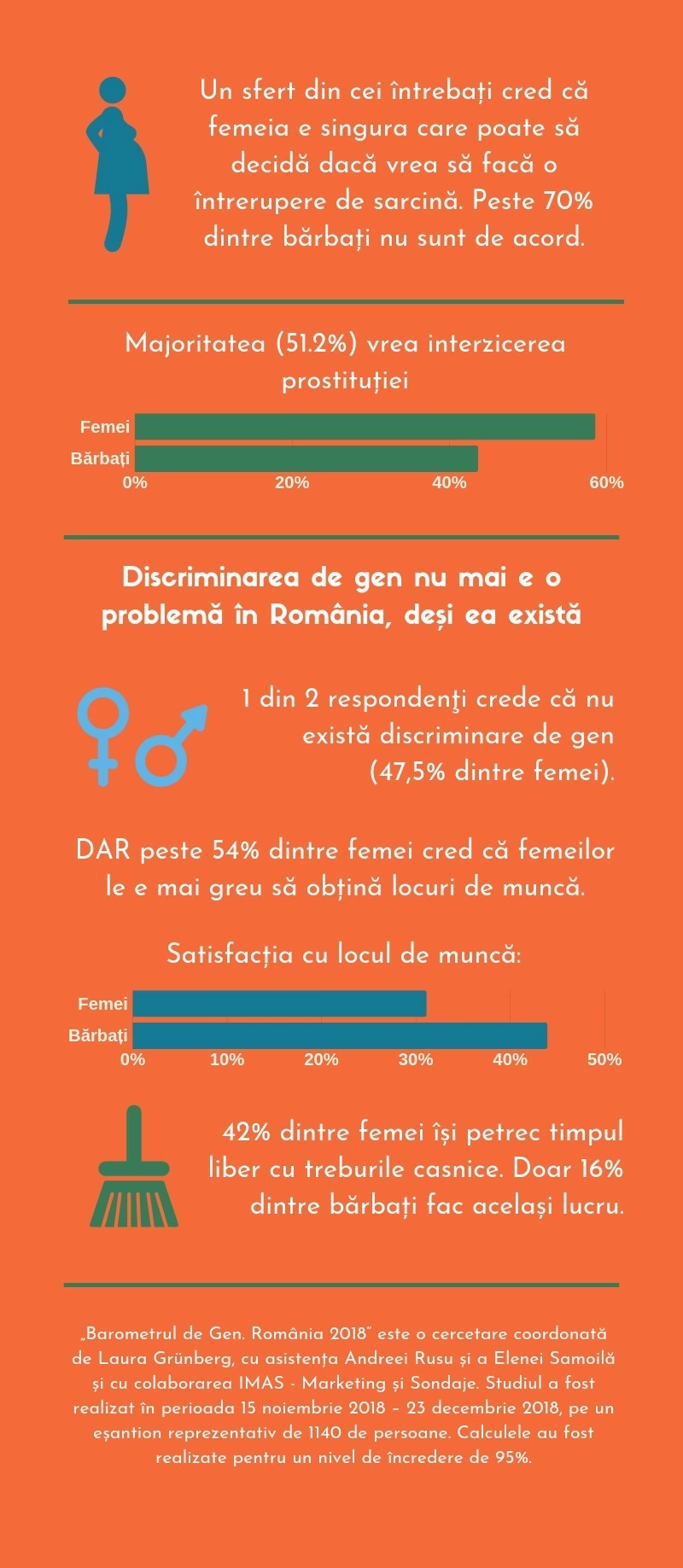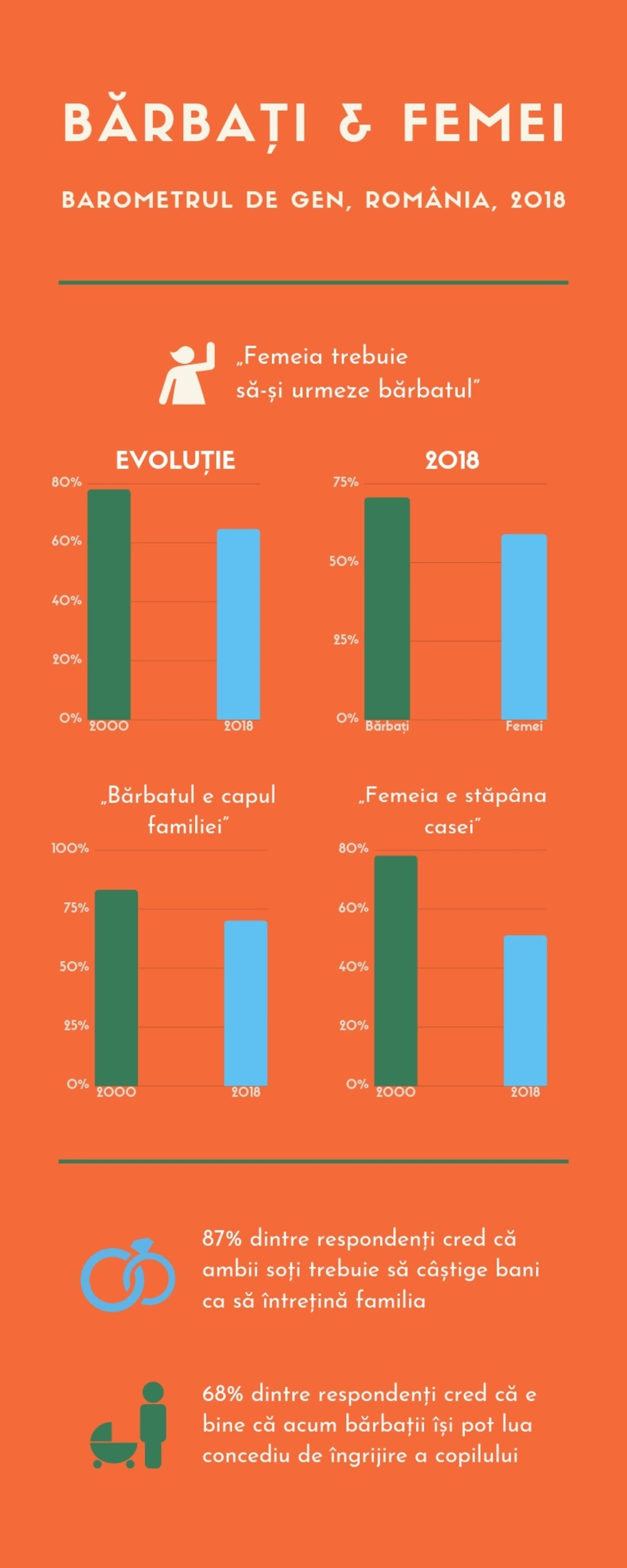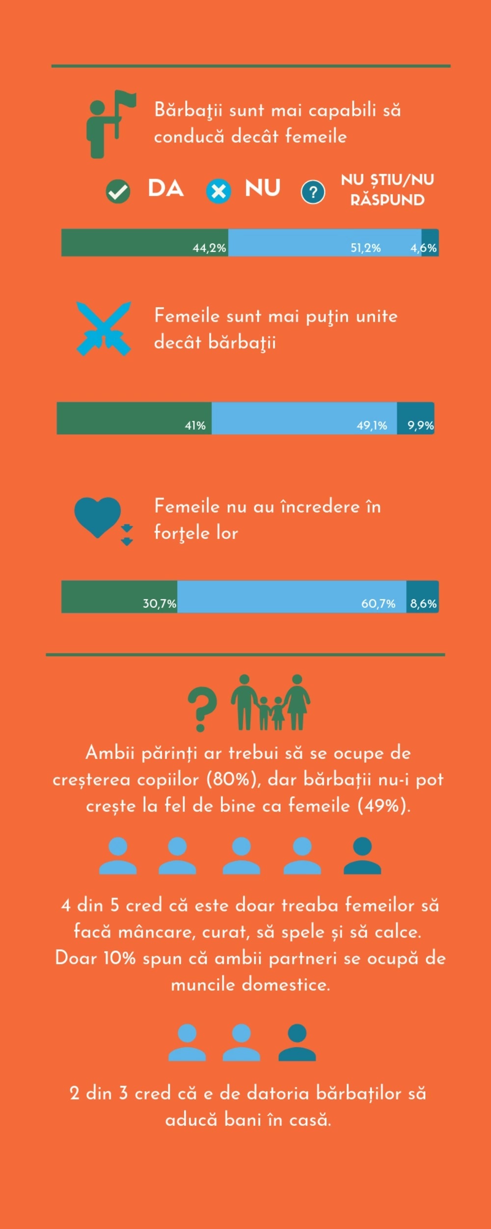 Citește mai jos despre celelalte: deși atitudinile misogine, care trimit femeia la cratiță, sunt în scădere, se mențin la cote ridicate. Deși românii consideră că misoginismul nu mai e o problemă în România, mulți spun, totuși, că discriminarea împotriva femeilor e o realitate. Deși suntem mai conștienți de violența de gen, mulți dintre noi cred că abuzul domestic trebuie rezolvat în familie. Deși bărbații trebuie să se implice în creșterea copiilor, considerăm că n-o pot face la fel de bine ca femeile. Și așa mai departe, după cum arată infograficul de mai jos – România înțelege că are probleme cu rolurile de gen, dar încă nu-i e foarte clar cum sau dacă trebuie rezolvate.