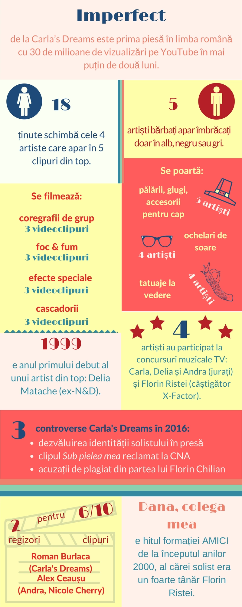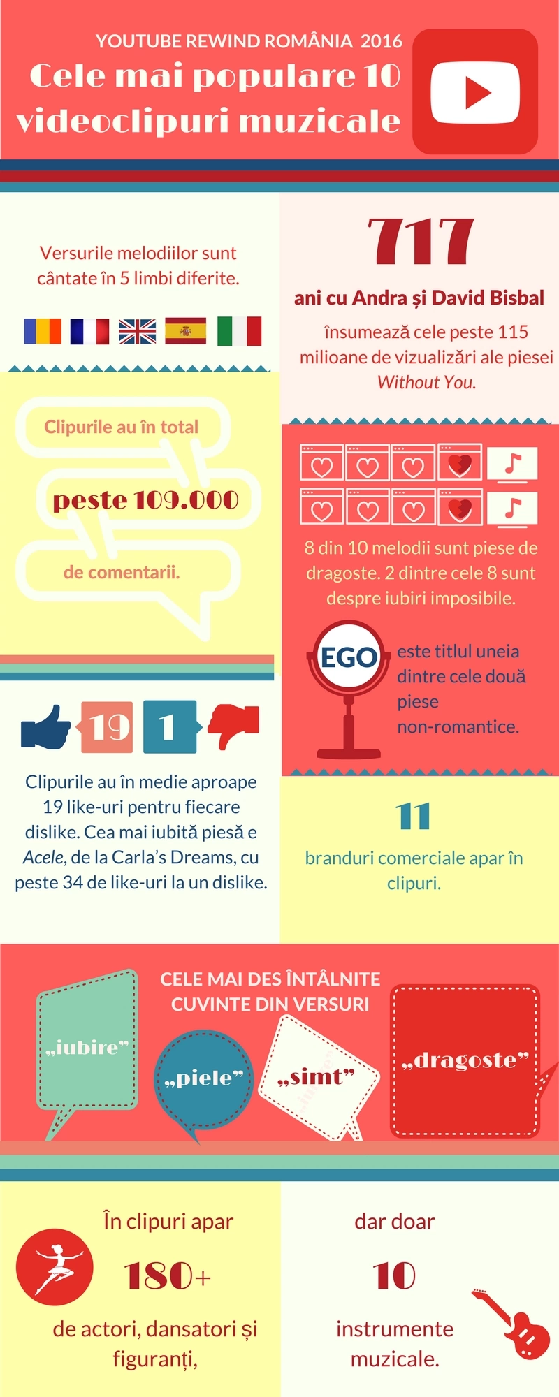 Am luat la pieptănat cele mai populare videoclipuri muzicale din România lui 2016, cf. topului YouTube Rewind. Am întâlnit nume cunoscute de pe la TV (Delia, Andra, Connect-R) - clasici, deja, dar niciunul prea vechi. Am văzut cum crește fenomenul Carla's Dreams, în zeci de milioane de vizualizări și zeci de mii de comentarii. Am analizat versuri, am numărat coregrafii, am căutat să aflăm de unde vin numele foarte noi. Am dat de splendidul cuplet de versuri: „Și seara stăm acasă, clătite cu Nutella/ O ardem clasic ca Arșinel și Stela.”