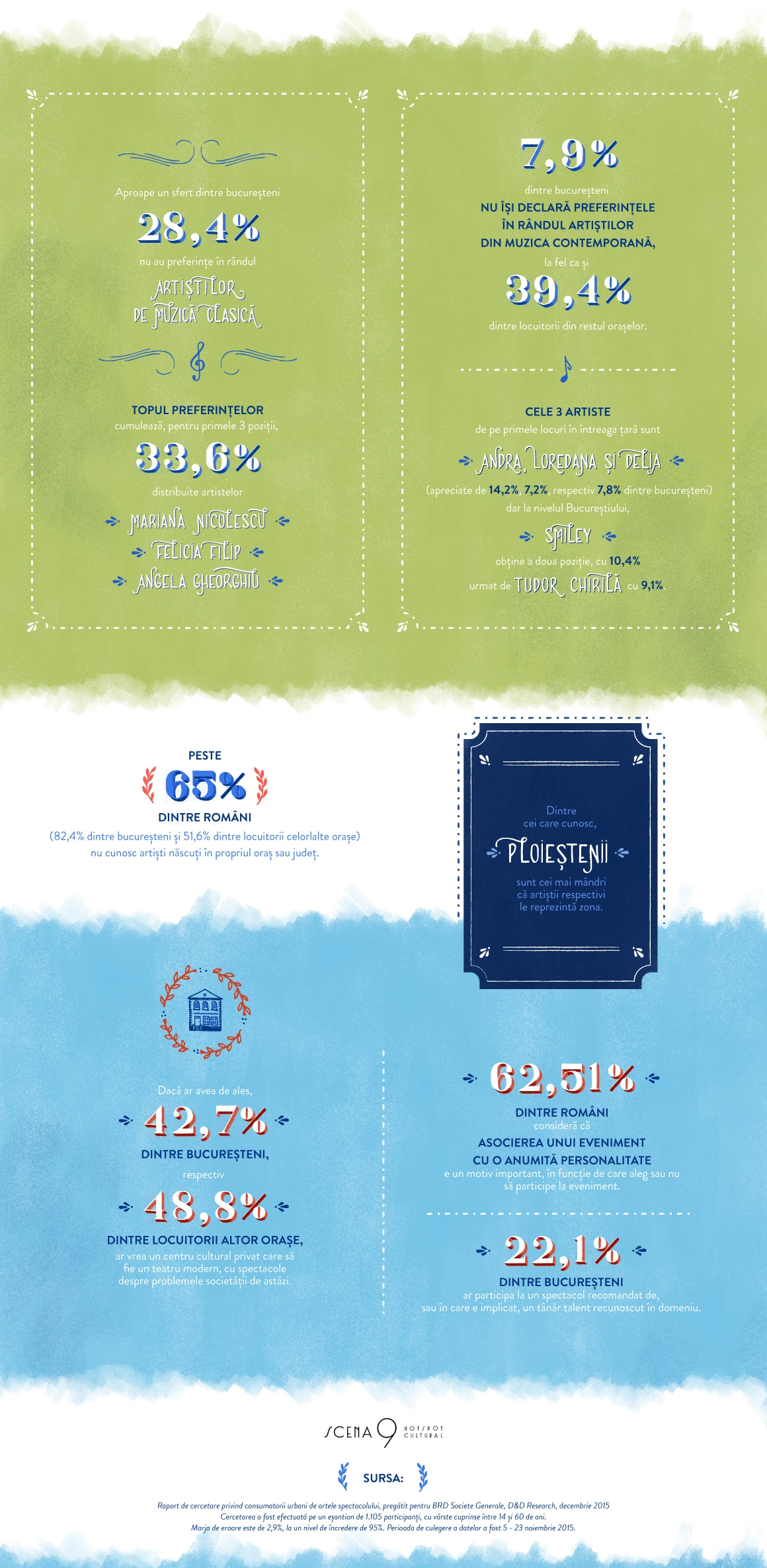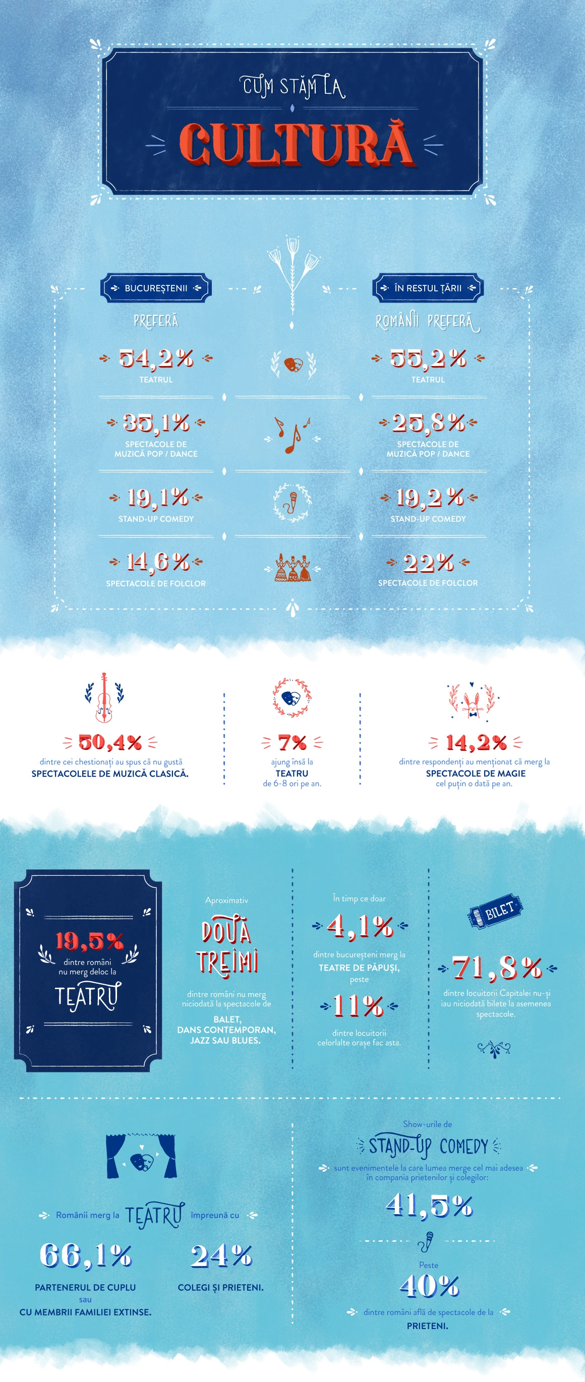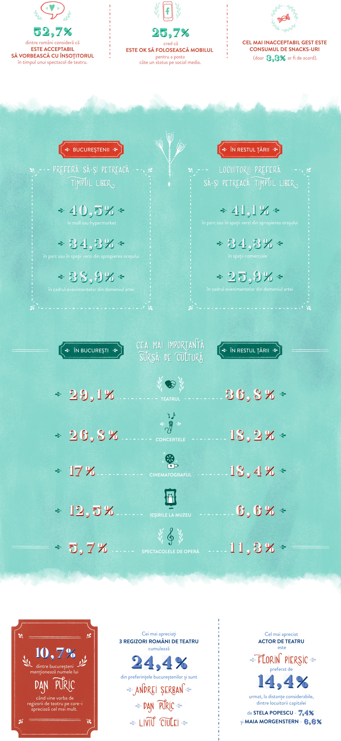 Românilor le place teatrul, iar asta e valabil și la București, și în celelalte orașe mari din țară. Numai că unul din 5 români nu merge niciodată la teatru. Mai mult de jumătate dintre noi consideră că e ok să vorbești cu omul care stă lângă tine în sală. Dacă îi întrebi ce alte forme de cultură consumă, românii îți înșiră experiențele care le sunt la îndemână: concerte cu șlagăre, spectacole de râs și muzică populară. În timpul liber merg la mall, la cumpărături și-n parc. La concertele de muzică clasică nu se duce jumătate din populația României, iar două treimi dintre români nu consumă balet, jazz, blues și nici dans contemporan. Ne plac: Dan Puric, Andra, Loredana, Mariana Nicolescu, Smiley, Florin Piersic, Stela Popescu și Andrei Șerban. Două treimi dintre noi nu cunosc niciun artist de la noi din oraș sau județ.