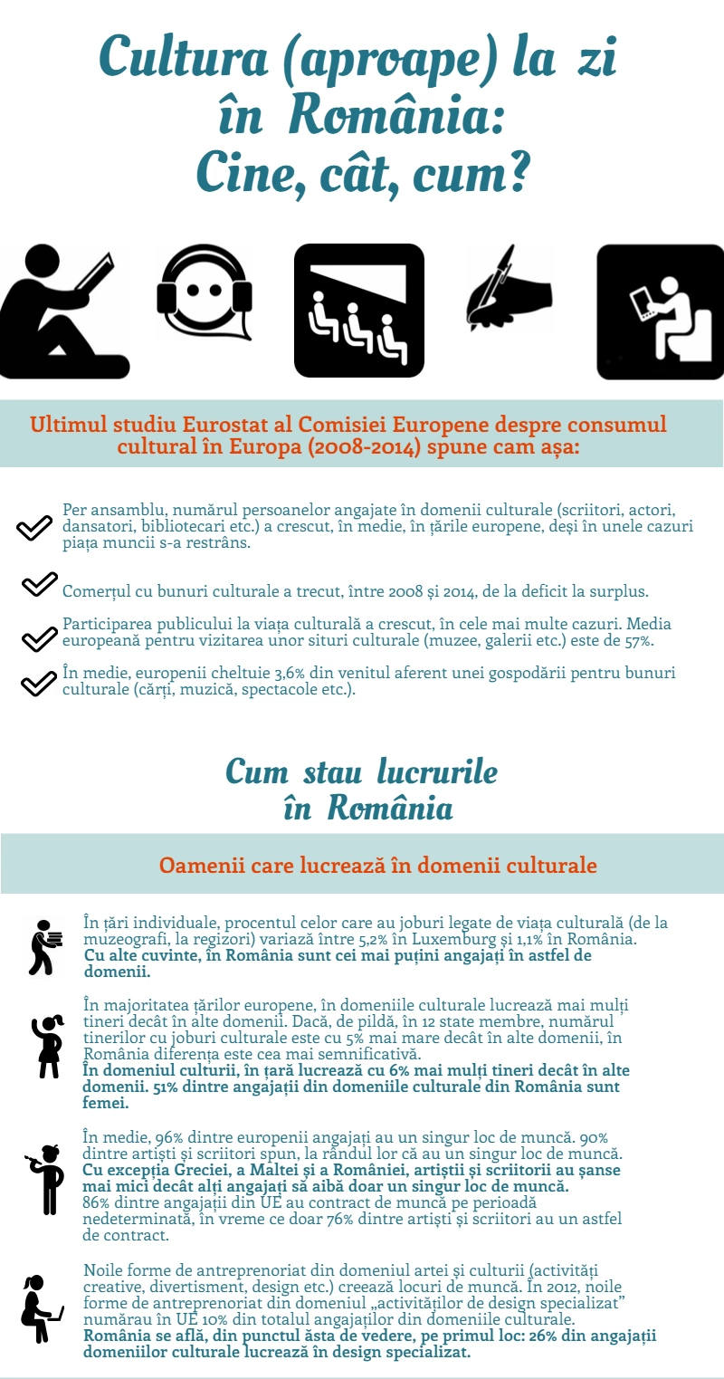 Vă propun ca, citind cele câteva informații pe care le-am adunat mai jos, să schimbăm placa: să concediem lamentația și să punem în loc un pic de analiză. Să ne-ntrebăm de ce foarte puțini români merg la teatru sau citesc o carte de plăcere? Să numărăm pe degete cinemaurile, sălile de spectacol, librăriile și bibliotecile din orașele în locuim, cu atât mai mult dacă nu trăim în cele câteva mari orașe. Să facem un calcul legat de câștigurile românilor și prețurile unor bilete la concerte sau la un film 3D. Câți ni le putem permite și câți găsim, de pildă, soluții alternative de a ajunge la cărțile pe care le vrem, dar care-s prea scumpe, soluții pe care statistica nu le poate cuantifica? Câteva explicații solide putem găsi în strategia națională privind incluziunea socială și combaterea sărăciei. Să aruncăm un ochi în manuale, ca să-nțelegem dacă, în vreun fel sau altul, e încurajată curiozitatea pentru arte & literatură, altfel decât prin mijloace îmbâciste și demult desincronizate de obișnuințele tinerilor de 2016. Să bâjbâim un pic în căutarea unor politici culturale în afara centrului - fie că e vorba de capitală sau chiar de centrul geografic al Bucureștiului. Ce și cum au făcut nenumărații funcționari ai culturii (și așa marginalizate în ordinea priorităților guvernelor) ca să ofere locuitorilor din orașe medii, mici și foarte mici spații de cultură, pe care să le și populeze cu evenimente?