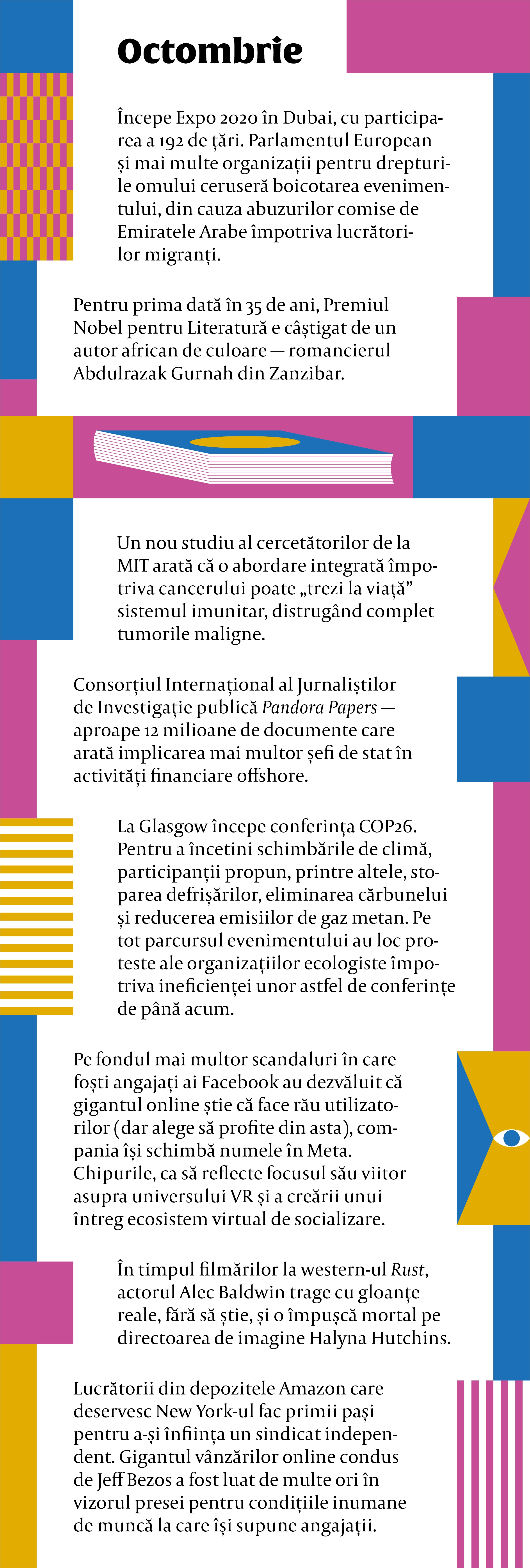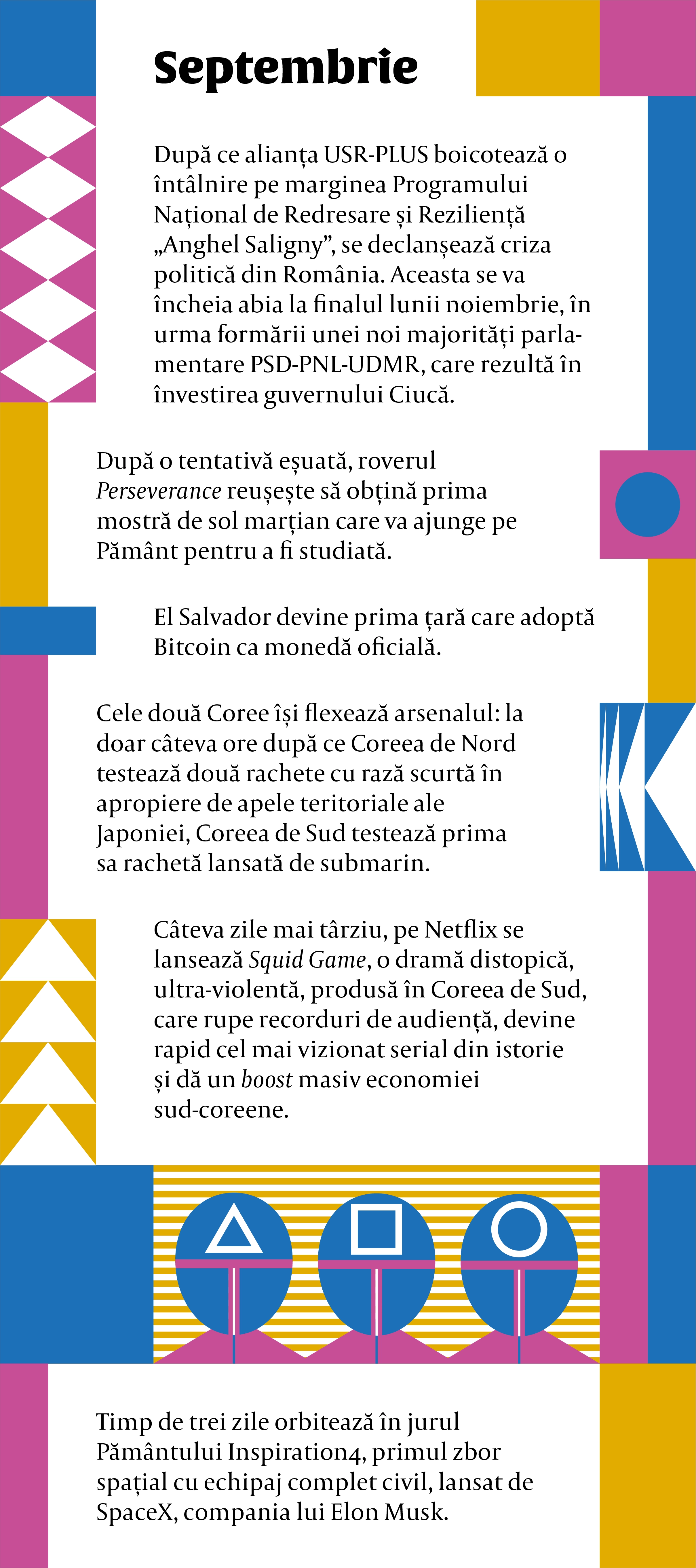 Pe tot cuprinsul globului au fost testate diverse scenarii de „redeschidere”, în anotimpul cald, însă sezonul rece a adus noi tulpini și restricții. Scena politică a văzut transformări masive, din Statele Unite până-n Moldova. Războiul și-a ițit capul - în Afganistan, în Israel și, momentan insinuant, la granițele Rusiei. Economia n-a dus-o nici ea bine, iar experții din lumea întreagă par să-și țină răsuflarea în așteptarea unei crize asupra căreia nu există consens. Întrebarea nu pare să fie „va fi rău?”, ci „cât de rău va fi?”