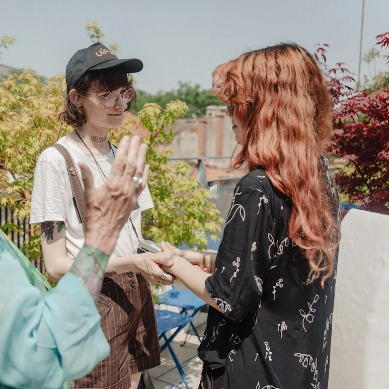 Fisher a binecuvântat peste 10 cupluri de vârste diferite. Fiecărora le-a vorbit despre dragoste, acceptare, compasiune. Sub tunica albastră i se întrezăreau tatuajele care-i acoperă brațele. Reprezintă momentul biblic în care Miriam și alte femei dansează după ce au trecut Marea Roșie, scăpând astfel din sclavie. Povestea lor reunește multe teme importante pentru Diane: rolul important al femeilor în credințele abrahamice, eliberarea prin dans și bucuria victoriei împotriva opresiunii. „Primul marș al libertății. Primul Pride”, spune ea când am întrebat-o despre asta.